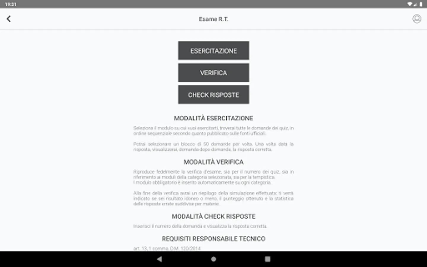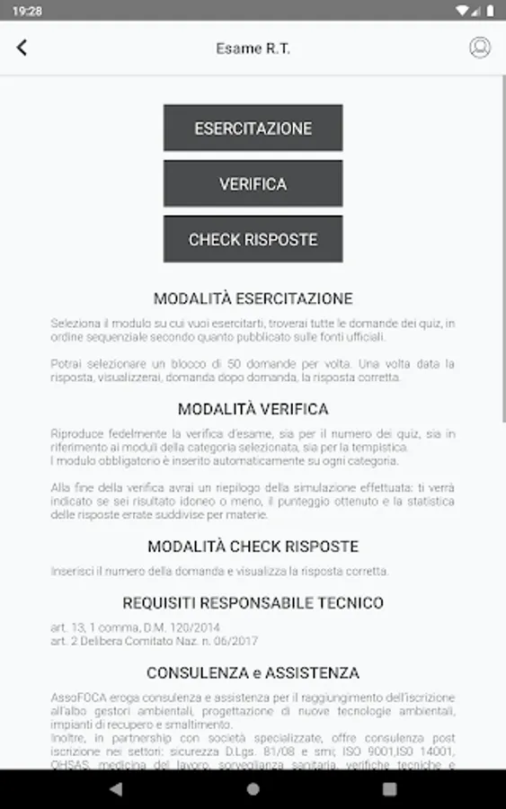Practice the criteria for examining Technical Manager (art. 13, paragraph 1, the Ministerial Decree 120/2014 art. 2 Nat Resolution Committee. N. 06/2017) of the Register of Environmental Managers. The exercises and the exam exam simulations are developed according to the criteria established by law (art. 13, paragraph 1, DM 120/2014 - art. 2 Nat Resolution Committee. N. 06/2017 - art. 4 Resolution Nat Committee. no. 07/2017). You'll find all ministerial quiz updated to 1st July 2017. A simple and reliable method for overcoming the checks carried out by AssoFOCA.