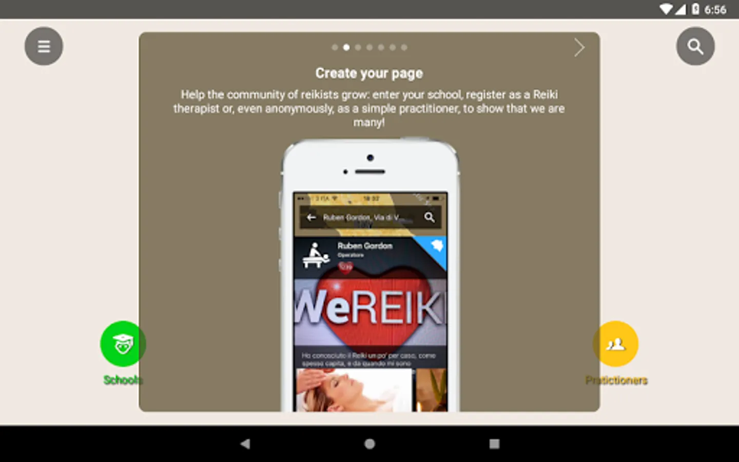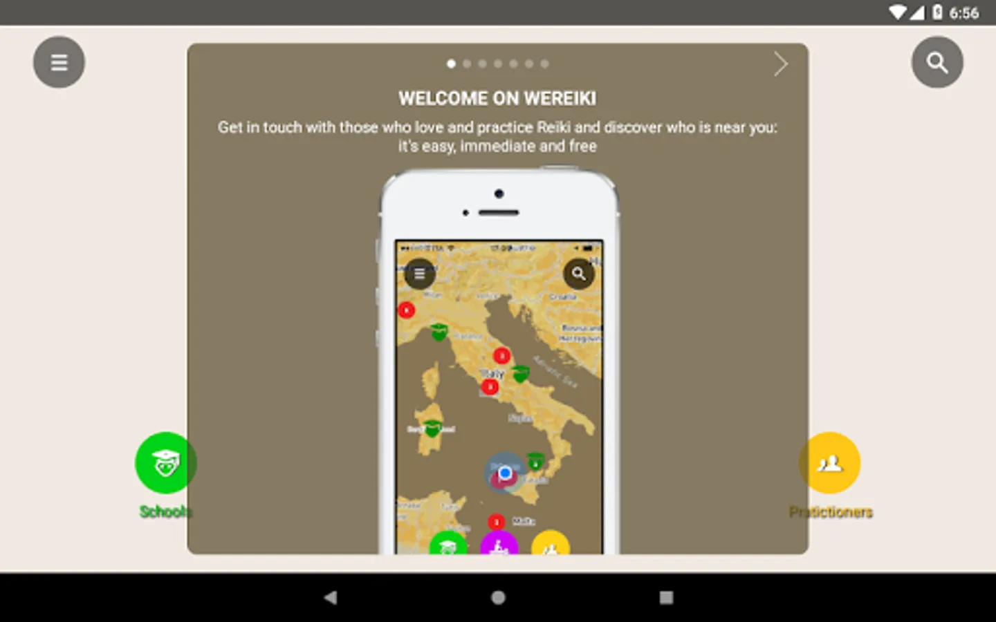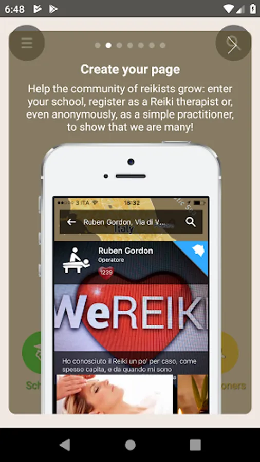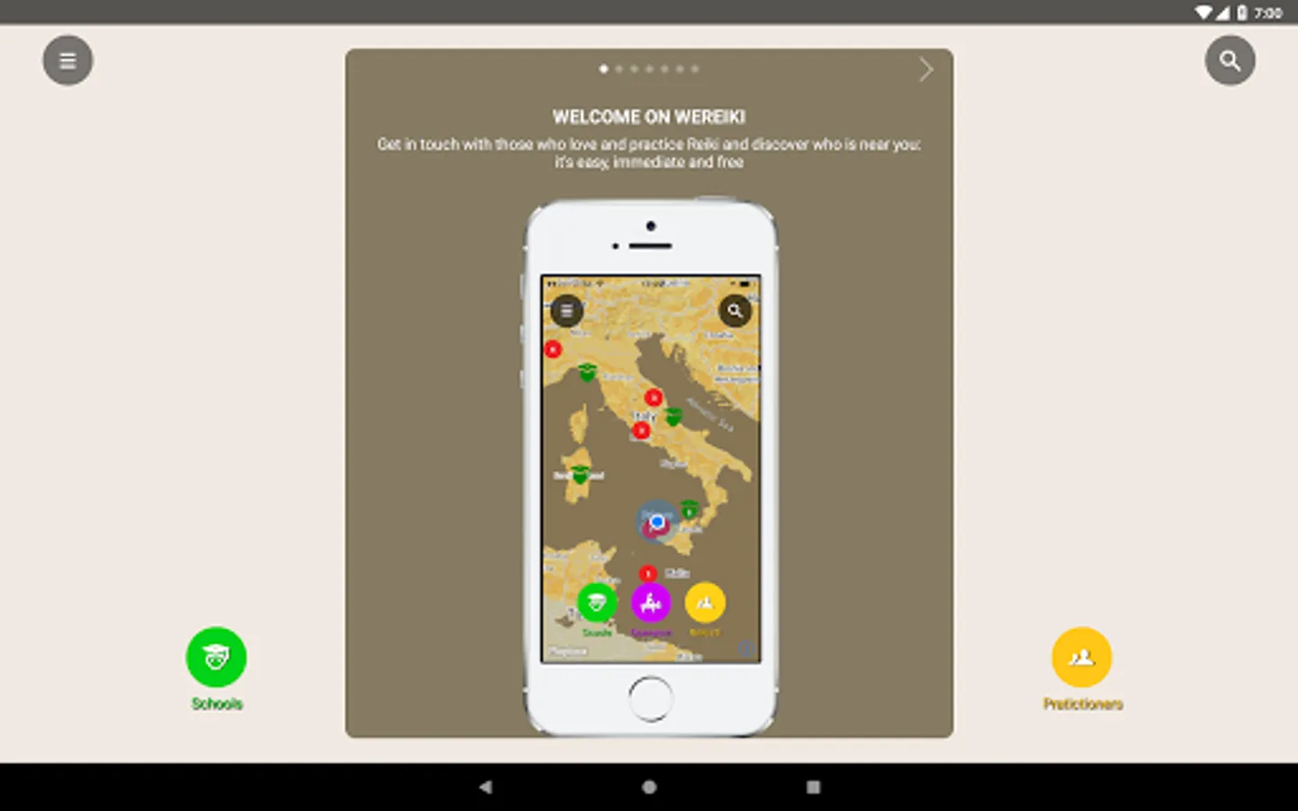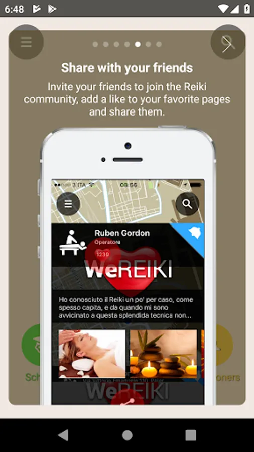 WeReiki was born to connect easily, quickly and for free all those who love and practise Reiki… Or would like to practise it. Schools and teachers can communicate easily with their students and make themselves found from those who would like to approach this fantastic technique. All practitioners who love to give treatments can make themselves known and can find more people to whom bring energy and wellness. Who is interested in Reiki but does not practice it yet can find all those who offer trial treatments, courses, exchange meetings near their place. Eventually Practitioners can count themselves, finding out they are many and are ever growing, wherever in the world: this is why is important to invite one own’s friends to enter WeReiki, to make visible the progress of a better world