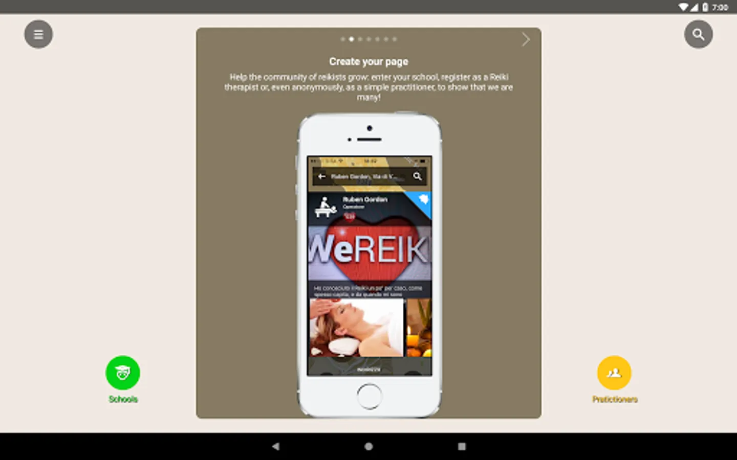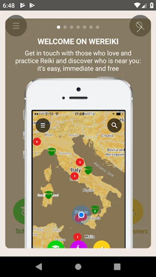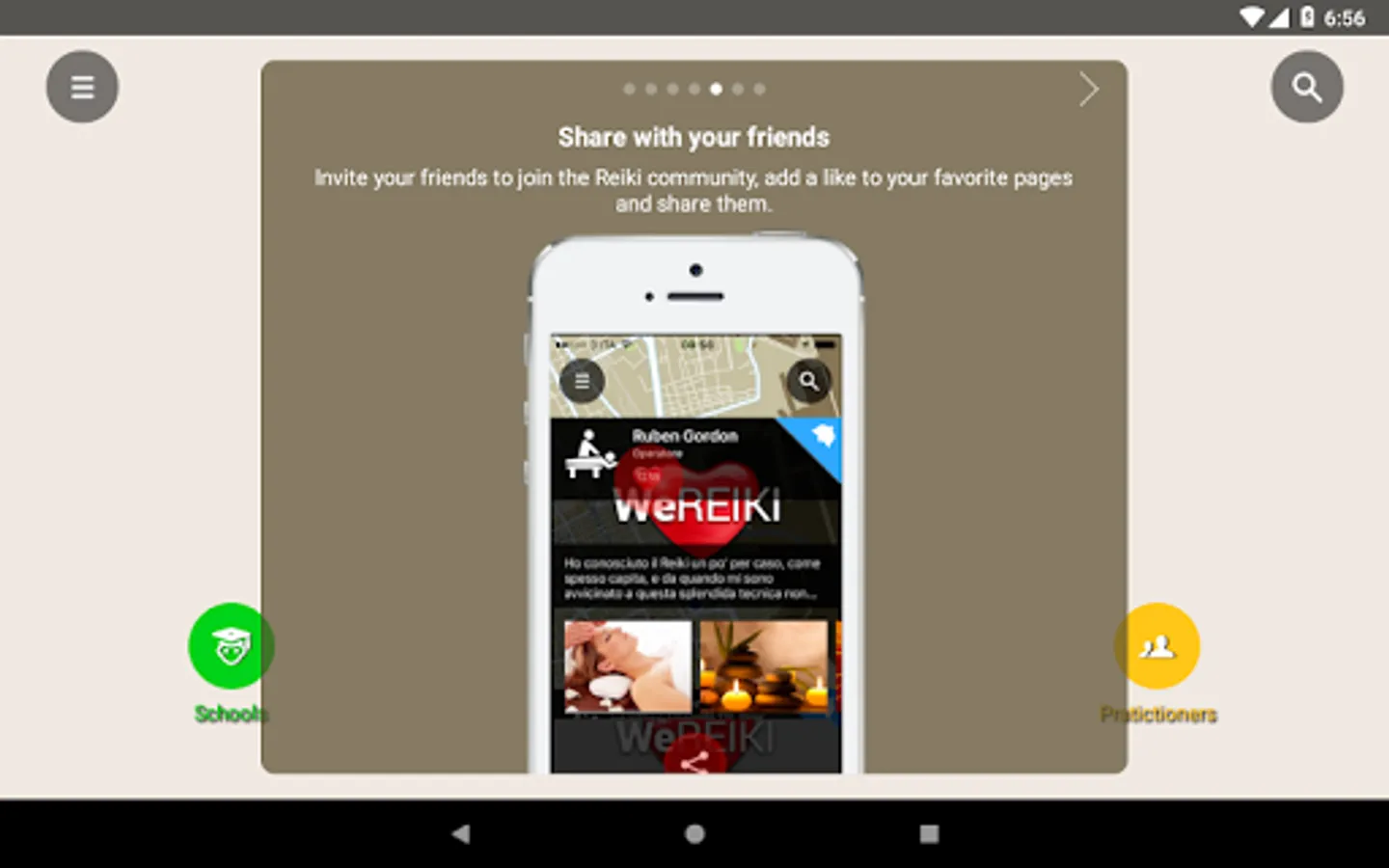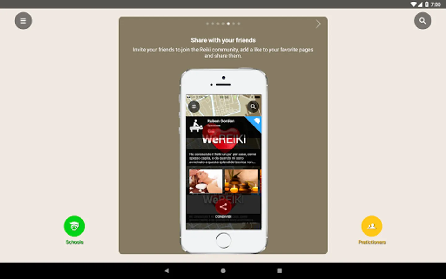 WeReiki was born to connect easily, quickly and for free all those who love and practise Reiki… Or would like to practise it. Schools and teachers can communicate easily with their students and make themselves found from those who would like to approach this fantastic technique. All practitioners who love to give treatments can make themselves known and can find more people to whom bring energy and wellness. Who is interested in Reiki but does not practice it yet can find all those who offer trial treatments, courses, exchange meetings near their place. Eventually Practitioners can count themselves, finding out they are many and are ever growing, wherever in the world: this is why is important to invite one own’s friends to enter WeReiki, to make visible the progress of a better world