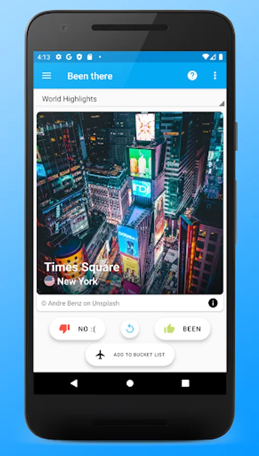 π± Simple user interface: Swipe right to tick off a place or up to save it to your Bucket List.