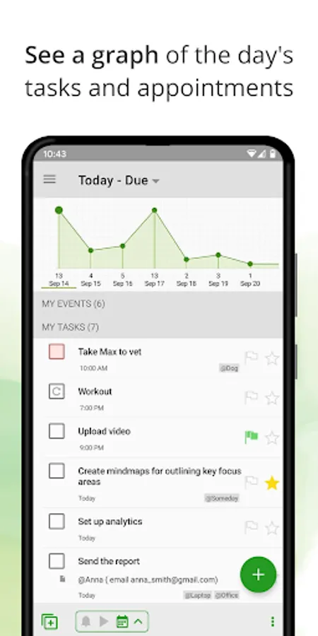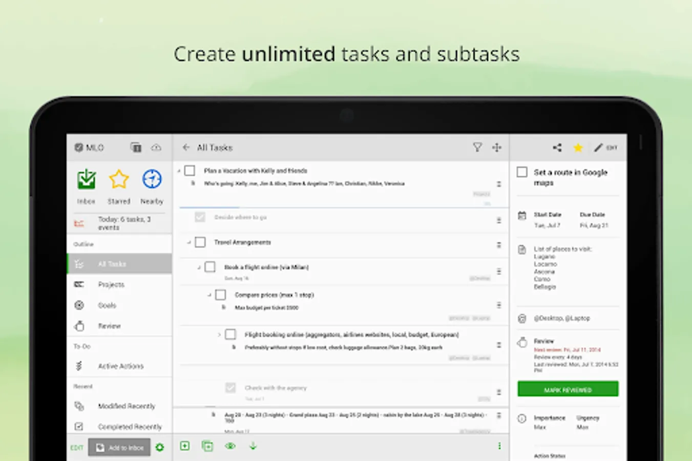 • Review: flag tasks for regular review to add new subtasks or change priorities