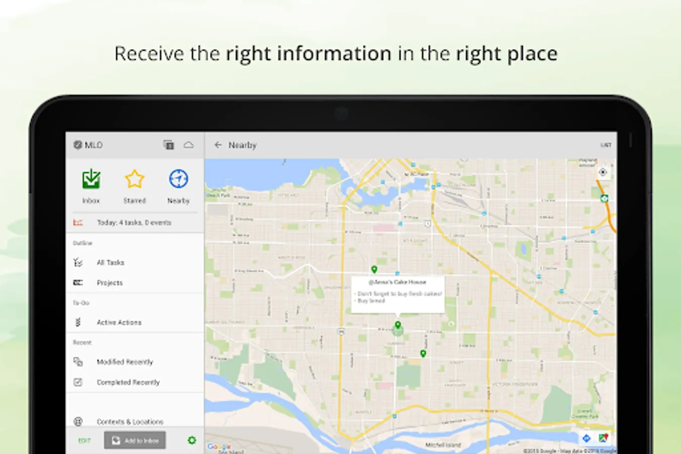 • Nearby view: get a list of actions for your current GPS location, with reminders as you reach or leave the location
