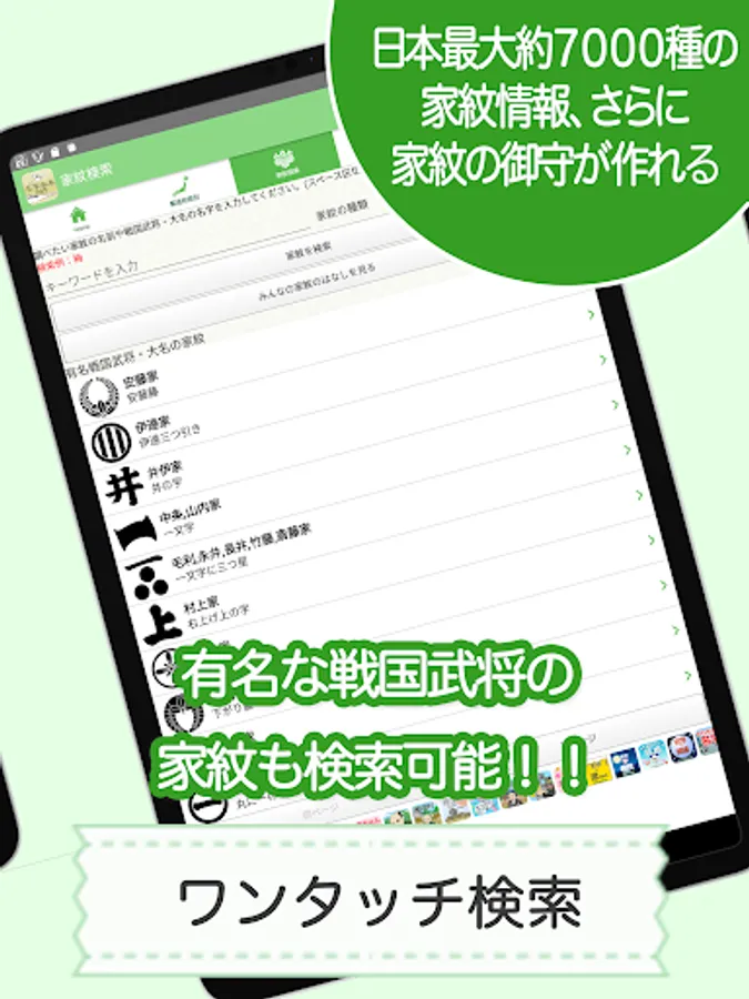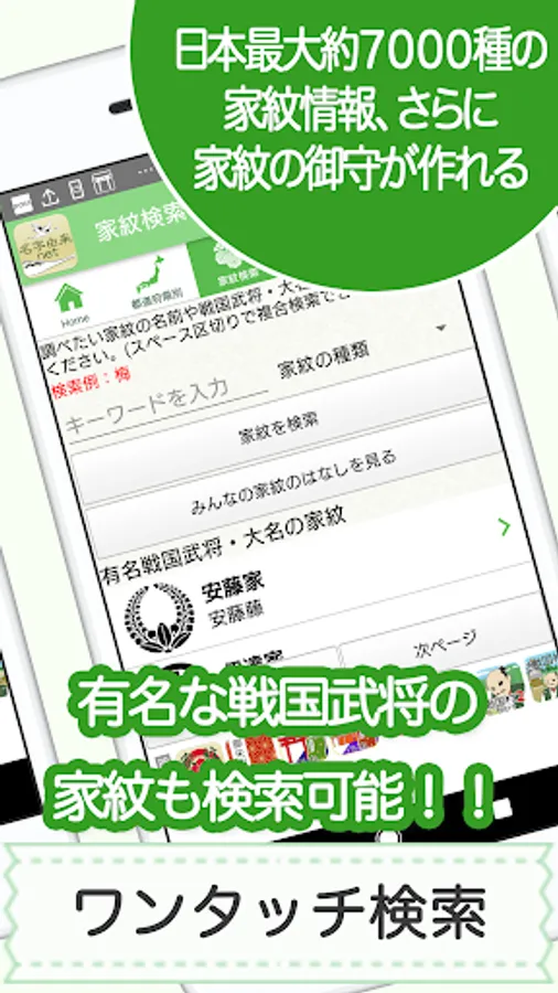 ・With the family crest search function, you can search for information on family crests based on the characteristics of the family crest and the surnames of famous warlords and feudal lords from the Sengoku period.