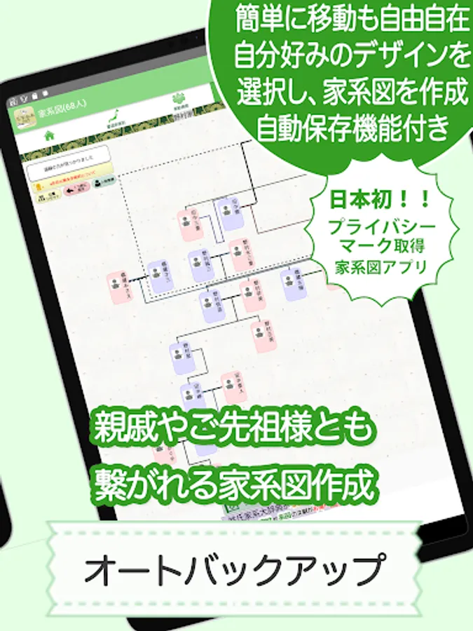No personal information or email address is required for free membership registration. Japan's only handy family tree app