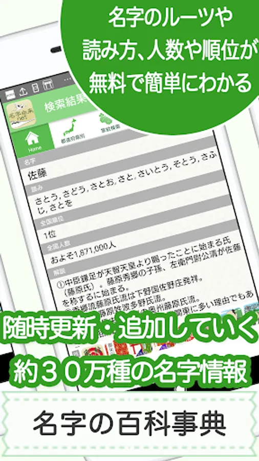 Surname derived net is a surname search dictionary app that covers more than 99% of Japanese surnames (surnames) and has the No. 1 surname access number (free).