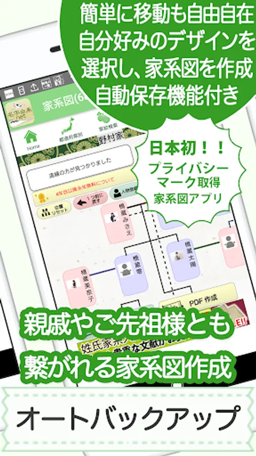First in Japan! Since it has a common ID function, you can refer to and edit the created family tree on the web (PC) version. [Family tree of everyone] https://myoji-yurai.net/familyTree/