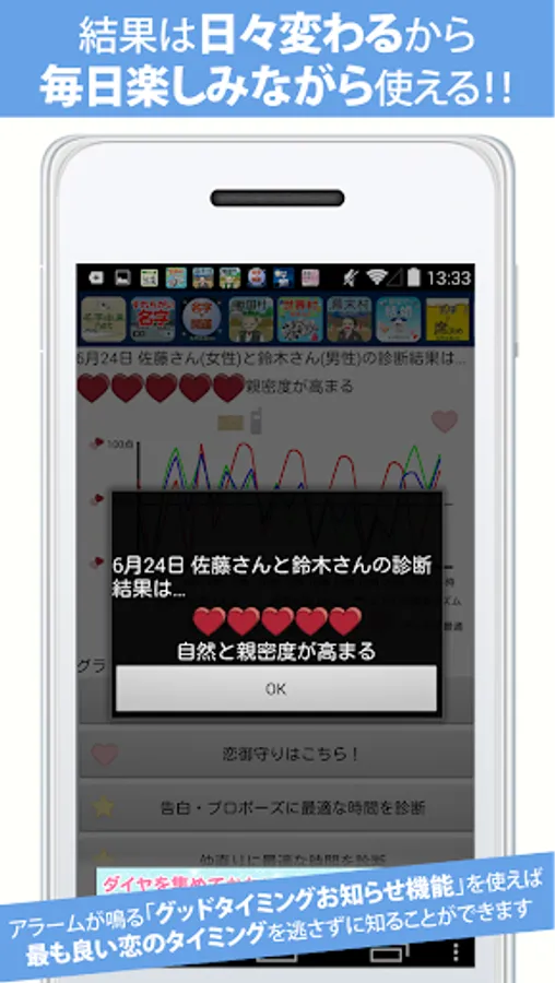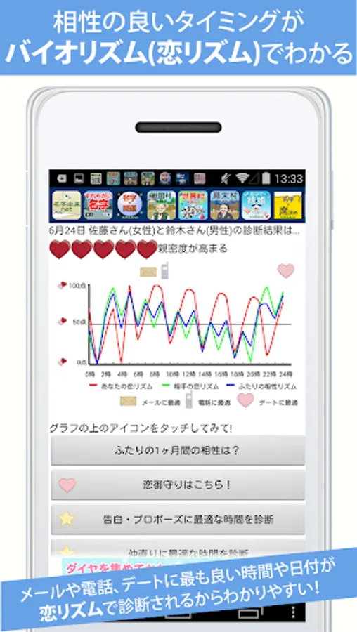 ・The best time and date for "email", "phone call", and "date" are diagnosed in an easy-to-understand manner with biorhythm (love rhythm). Furthermore, by using the "good timing notification function" that sounds an alarm at that time, you can know the best timing of love with your partner without missing it.