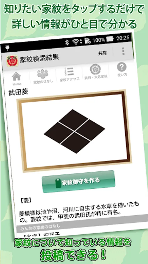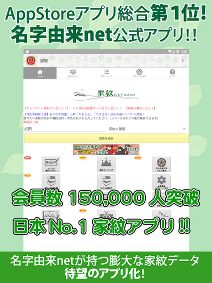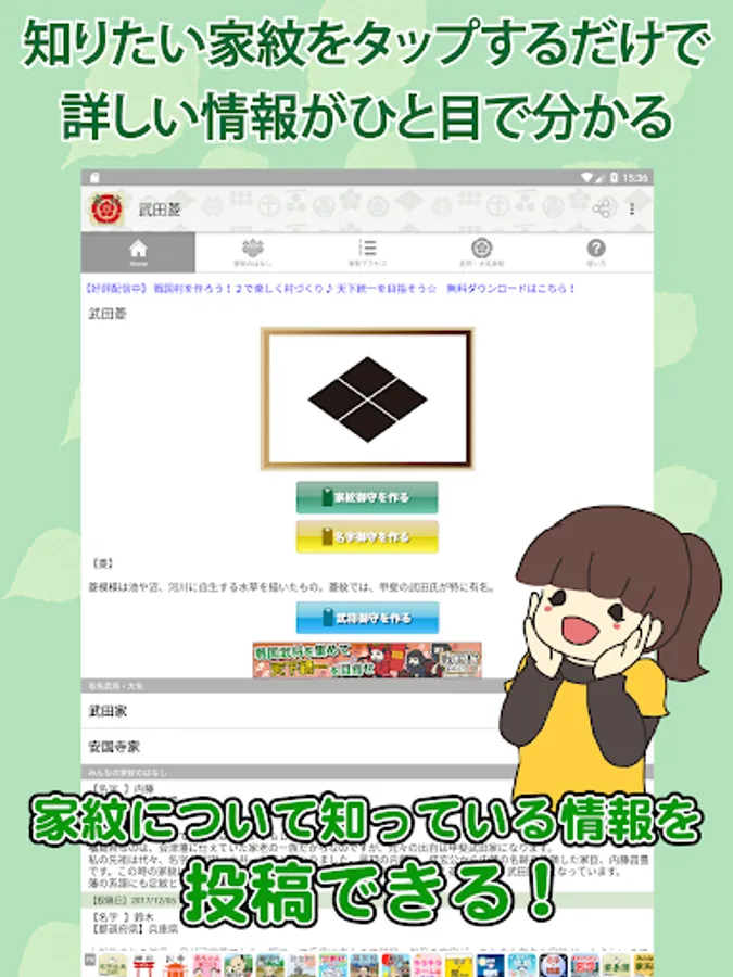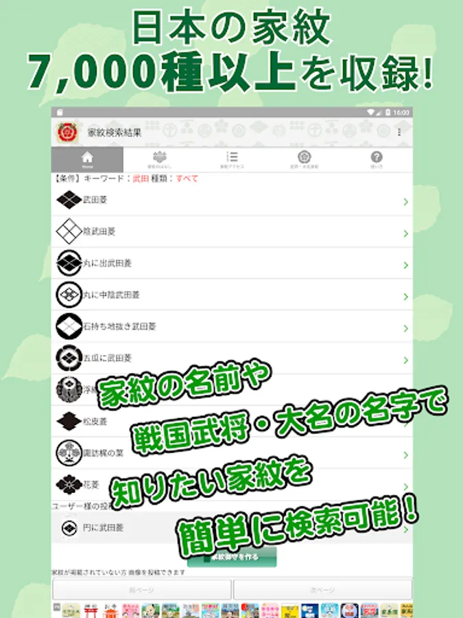 Covering more than 8000 types of family crests, the largest in Japan, you can learn anything about family crests with this one app!