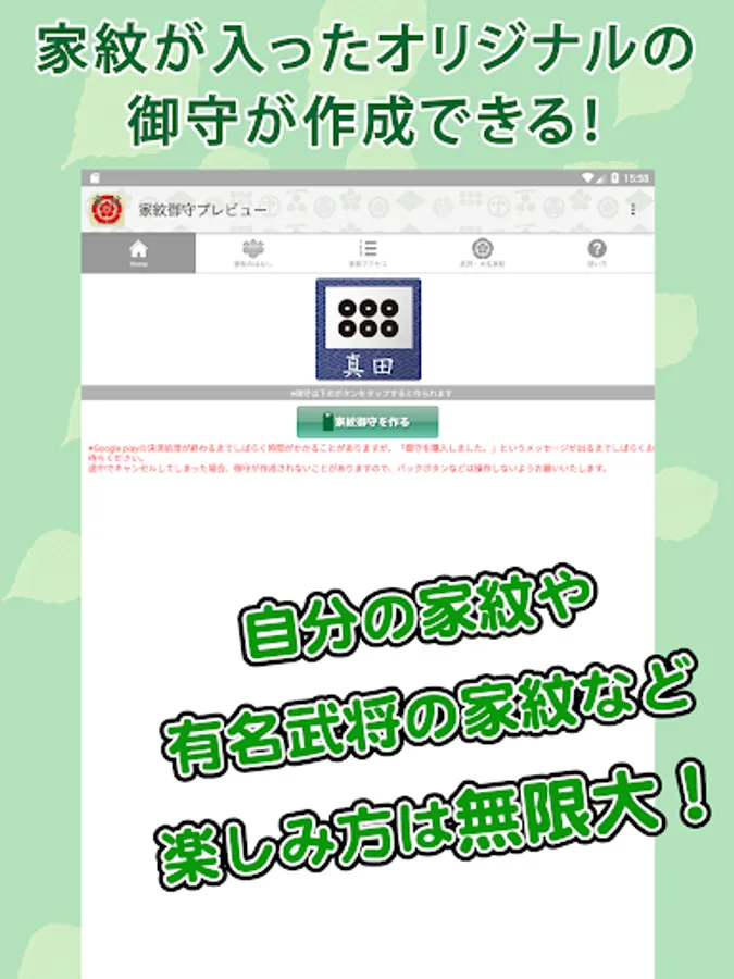 ・You can get an original "family crest charm" by combining family crests, surnames, and designs of yourself, your favorite Sengoku warlords, characters from historical dramas, etc.