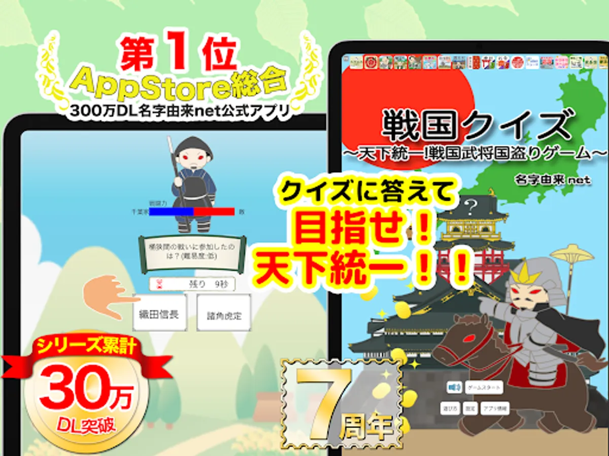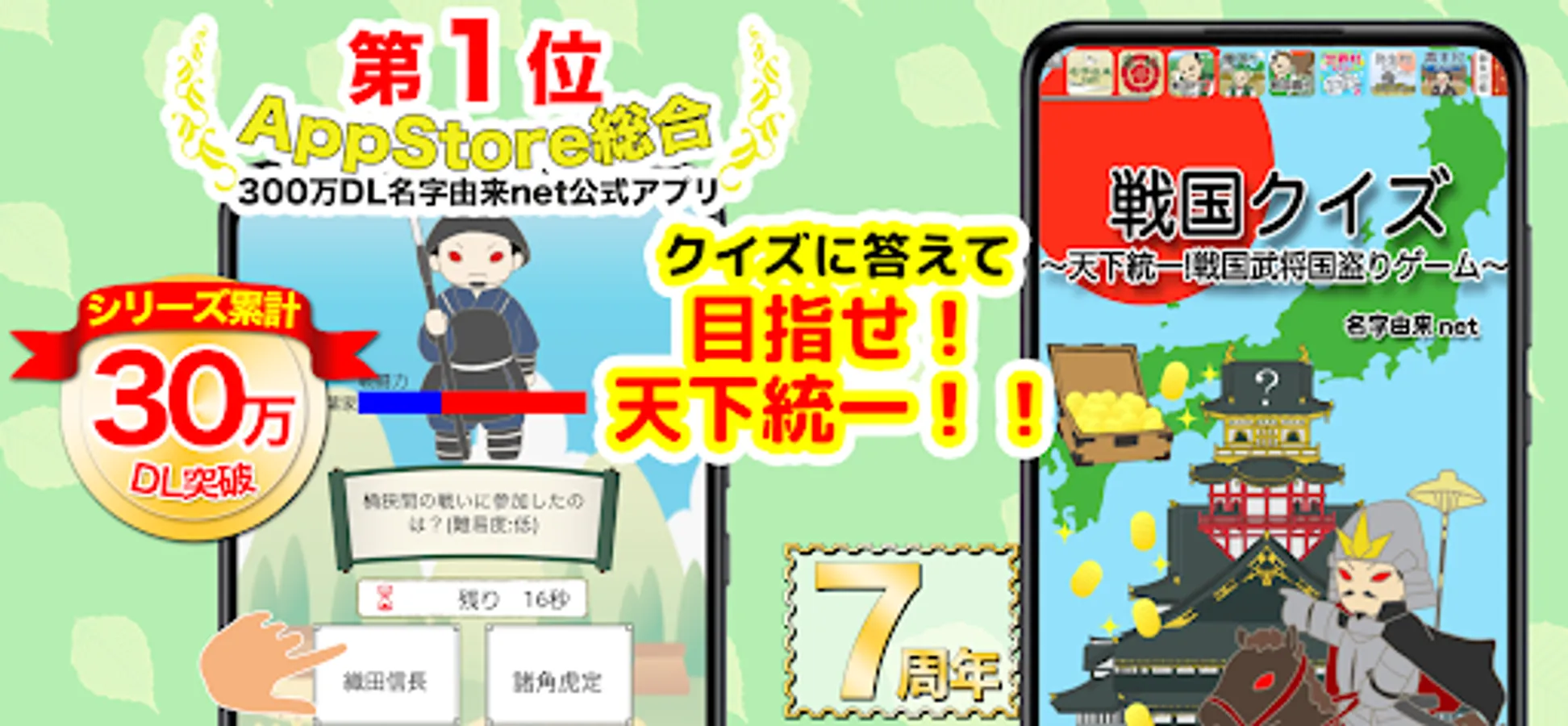 This is a quiz game app that allows even those who are not interested in surnames (surnames) to challenge the quizzes of the Sengoku / Edo period stage, grow the country, and achieve unification of the world. In the ranking, you can compete with the "strongest countries" in Japan, such as official rank, number of robberies suppressed, number of vassals, number of gold coins, etc. Answer the Warring States period quiz and experience the real thrill of growing your country. This is the second installment following the blockbuster game "Let's make a Sengoku village!"