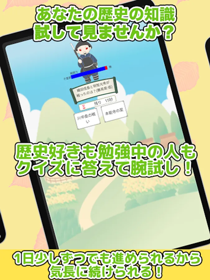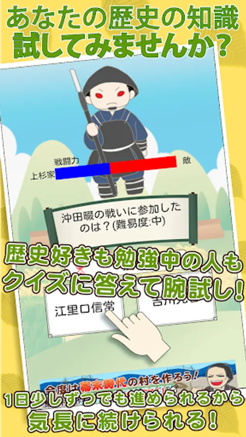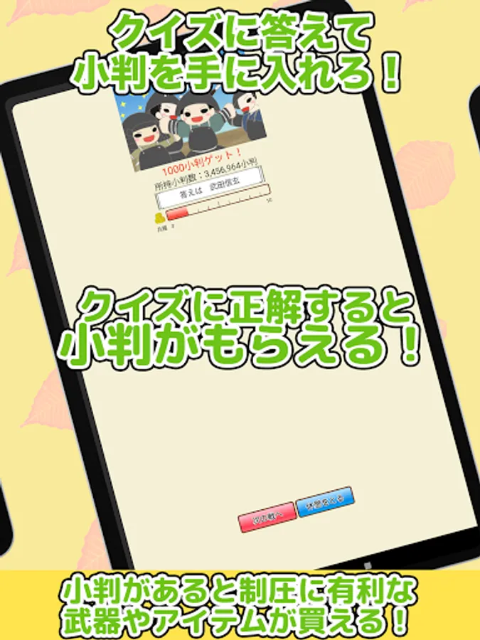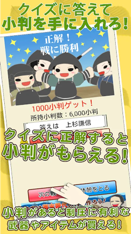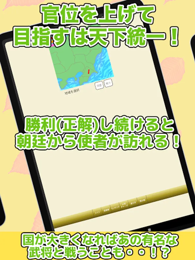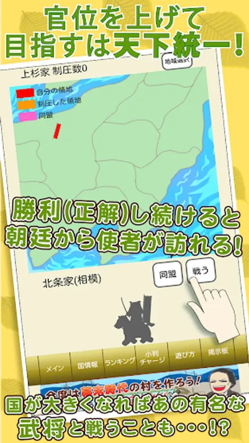 You choose a Sengoku daimyo from a country and take a quiz set in the Sengoku period or the Edo period. In order to unify the world, it is necessary to increase the number of vassals, accumulate provisions and coins, and equip the country with weapons and buildings. The important thing is to take as many quizzes as possible by increasing the gold coins and making full use of the supplies necessary to answer the quizzes. Your mission is to unify the world and expand your country.