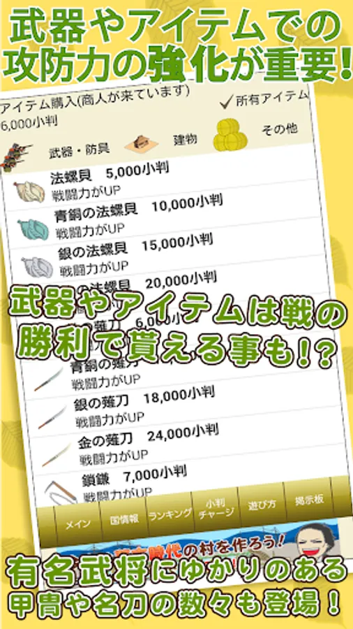 Along the way, many warlords, enemies, and intruders attacking from outside will come along with quizzes. In order to protect the country and conquer other countries, it is important to efficiently obtain guns, weapons, and armor from merchants. As the country grew, envoys from the imperial court and mainland China would come, and the official rank would gradually rise, and the country would develop. Starting with your spouse and yourself, you will need your historical knowledge and the wisdom to develop the country in order to increase the number of retainers and make it a strong country. From now on, while challenging quizzes, you will survive the Warring States period and achieve unification of the world.