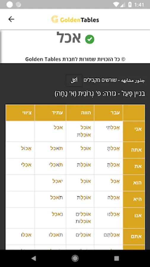 يسُر شركة "جولدين تيبيل" ان تقدم لكم هذا التطبيق القادر على تصريف الافعال باللغة العبرية الى اللغة العربية في جميع الازمان وتقديمها في جدول حسب المبنى