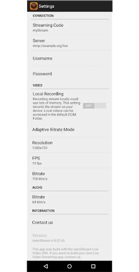 The nanoStream Live Video Encoder App allows live video capture, broadcast and stream from your device camera to nanoStream Cloud or 3rd party media servers.