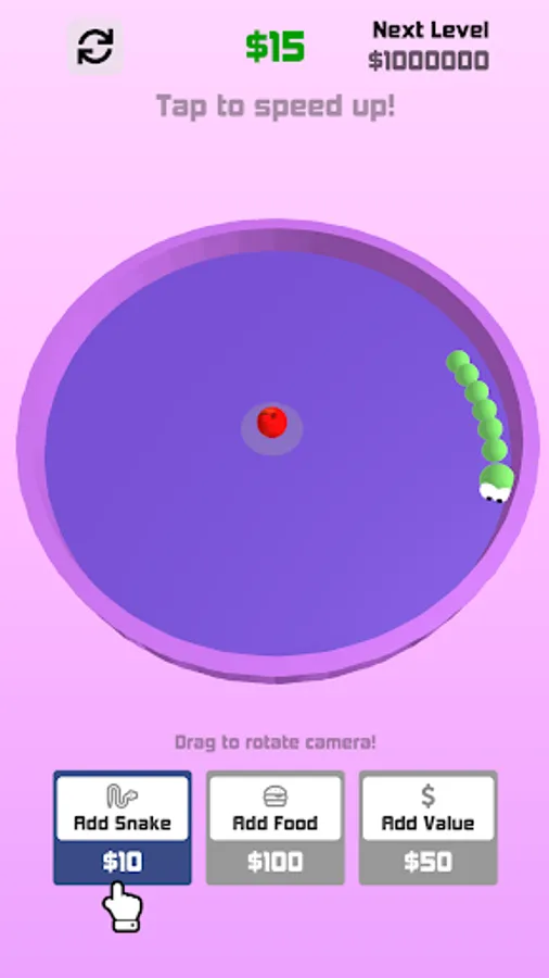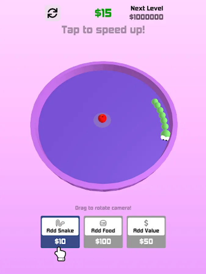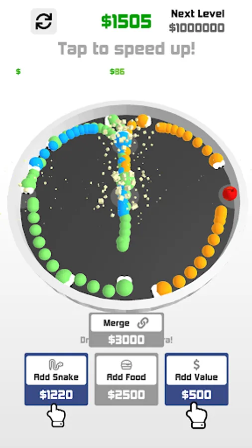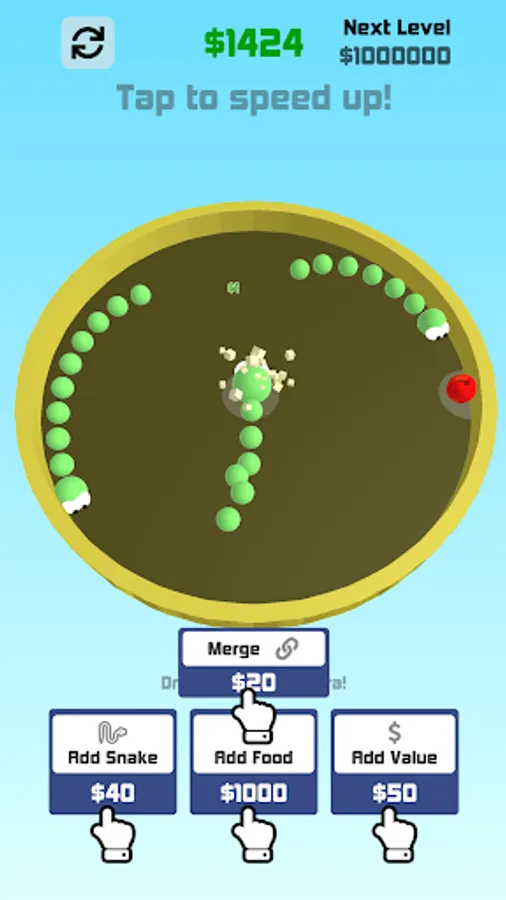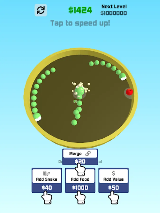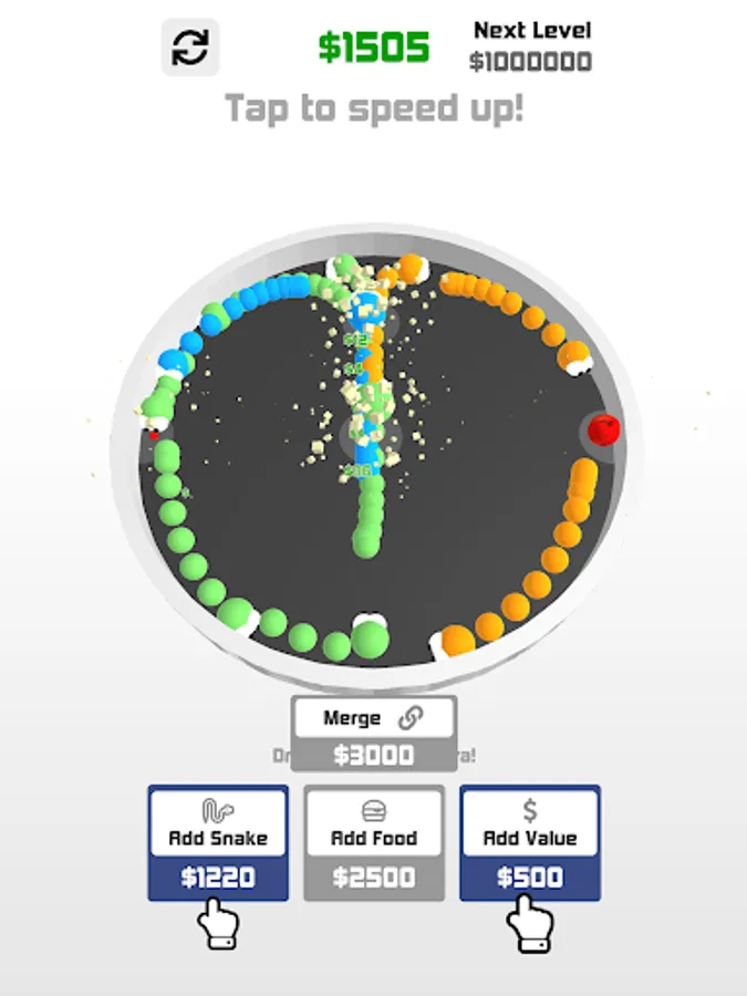 Add/merge Snakes and food to earn cash and get your snake world thriving.