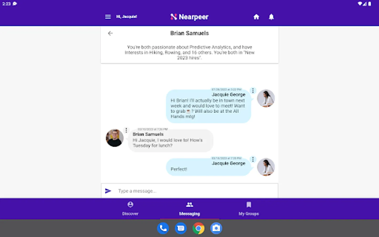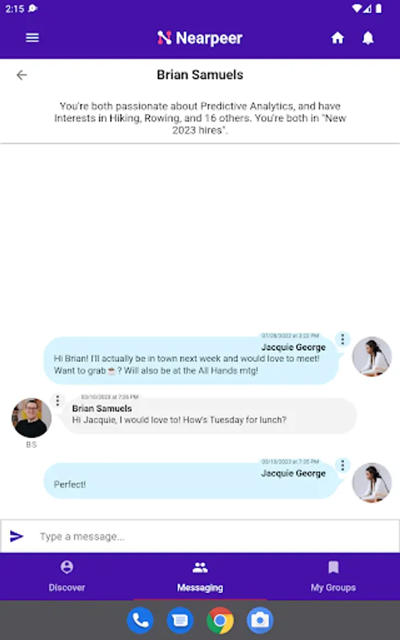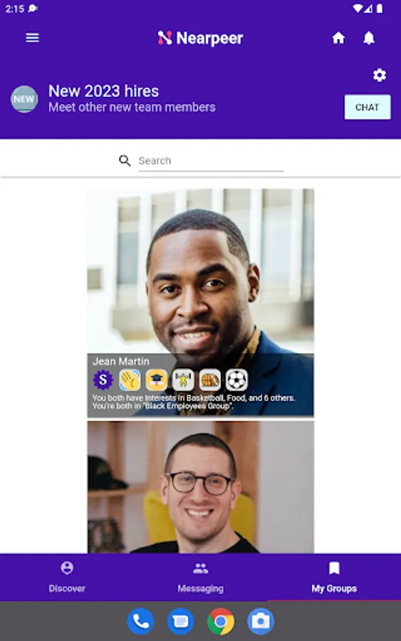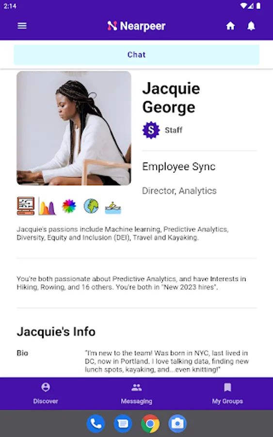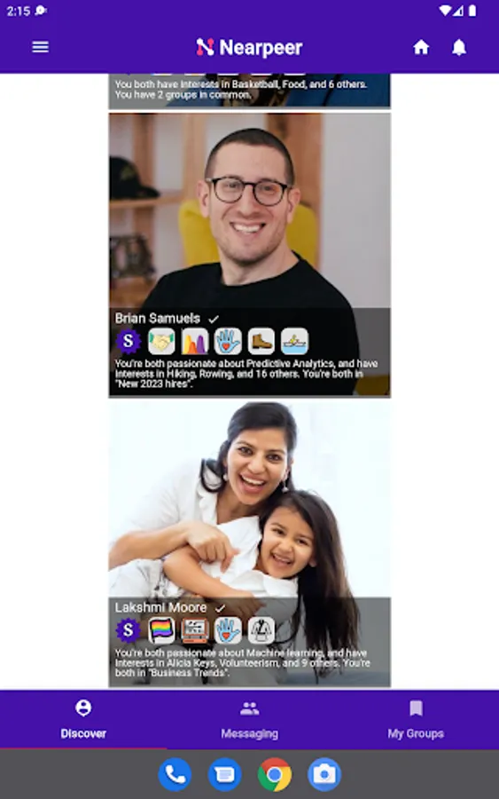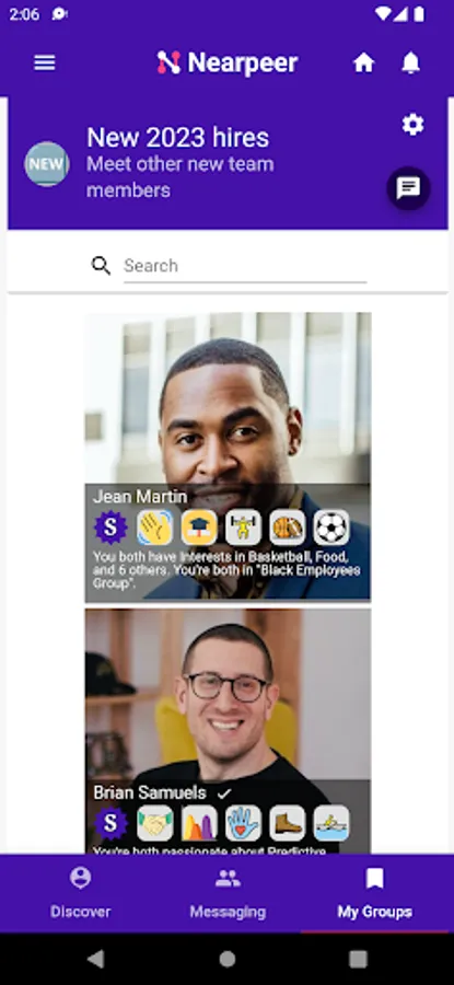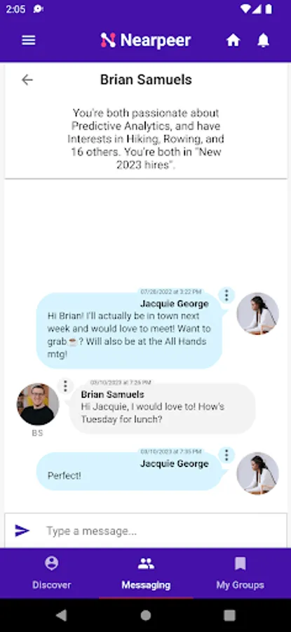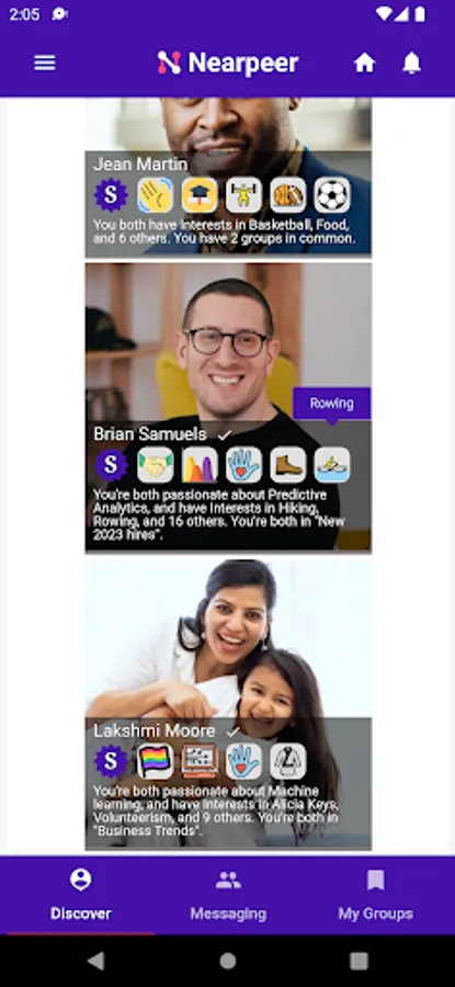Discover what you have in common with your work peers as a way to get to know each other better. Nearpeer’s peer matching algorithms show you what you have in common with your colleagues, such as work topics, interests, passions, life experiences, hometown, and more!