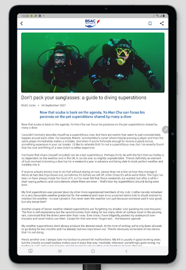 Underwater adventure doesn't have to wait, join BSAC for some memory-making scuba diving. With the BSAC app you can stay informed with BSAC News & blogs, start your scuba journey by finding a local club or training centre and view BSAC training courses available.