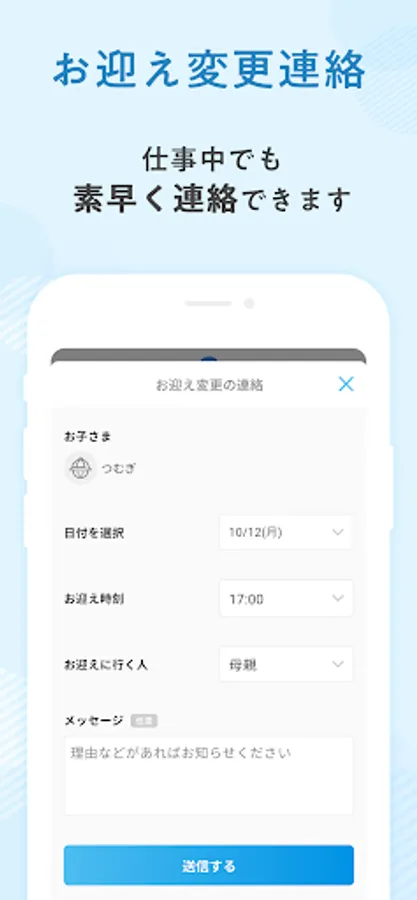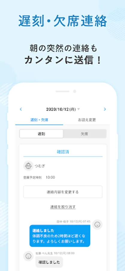 ・Tardiness/absence/pick-up change notification: You can contact us about tardiness/absence/pick-up change from your smartphone.