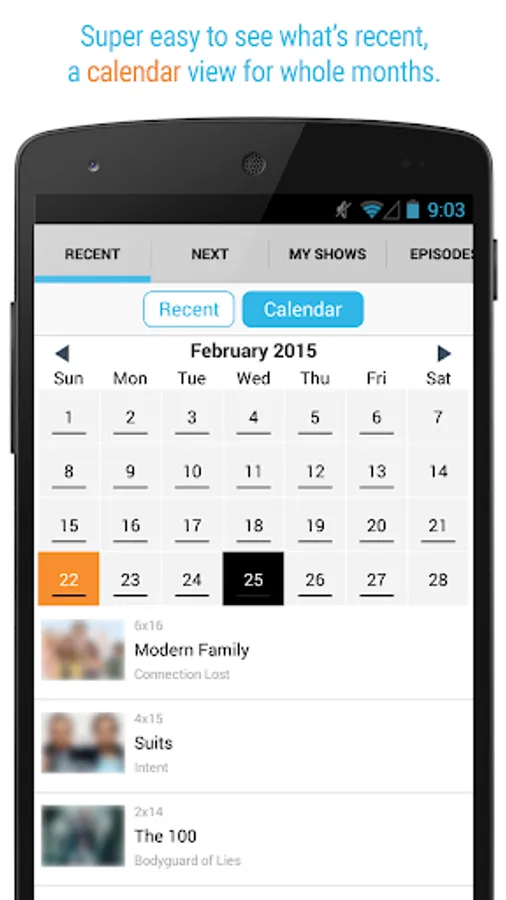 RECENT - see what shows just aired and what is coming tomorrow. See all the shows or just the ones you follow.
