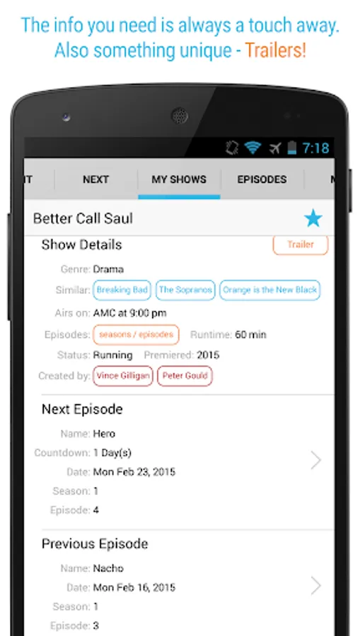 TRAILERS - check out TV shows trailers and easily discover great series that you'll like. A unique functionality that only Next Episode has!