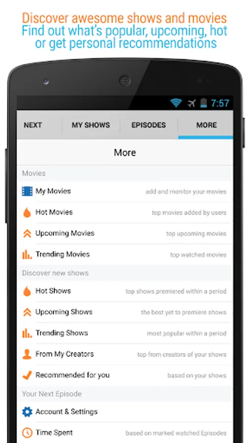 Easily track TV shows and the Movies you follow and discover new - great ones that YOU'll like! Clean interface, useful and unique features and a joy to use - this is Next Episode!