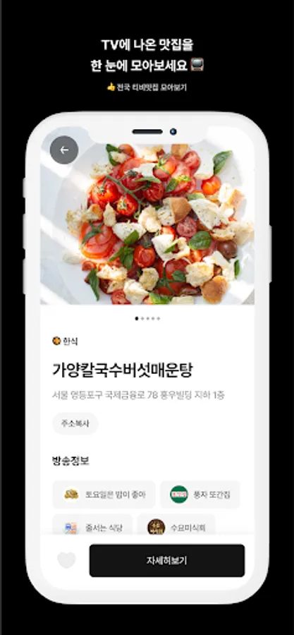 TV Restaurant is an app that allows you to easily find the best restaurants introduced on television. Find popular restaurants on the food program through the map. Additionally, you can search for restaurants by selecting the food category or program you want.