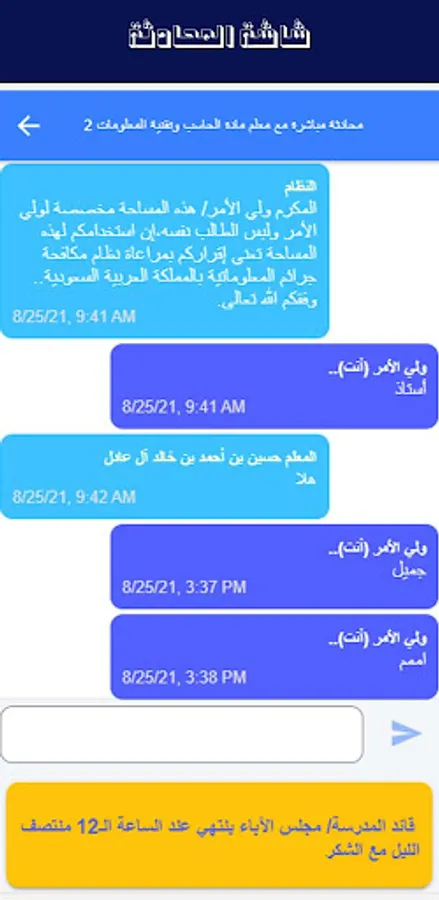 An application based on recognizing the opinions of male and female teachers about students and direct conversation between them at a predetermined time from the school administration, receiving notifications from the school and documenting delivery
