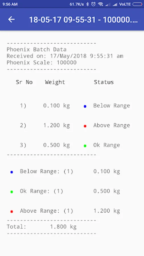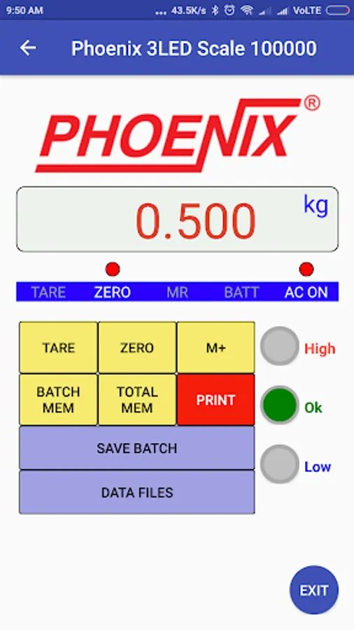 Phoenix 3-LED App can connect to any compatible Phoenix weighing scale via BLE Bluetooth technology. Using this app, user can see the comparison between current weight and preset weight by 3 big LEDs in the App: RED - HIGH weight; GREEN - OK weight; BLUE - LOW weight. The detailed weighment records with 'HIGH', 'OK' or 'LOW' tags can be stored in the user's mobile phone, using this app. These records can be further shared in excel/pdf/text format from your mobile phone. The user may also use this app as a remote real-time display and remote controller for Phoenix weighing scales. This app is extremely suitable for packing and check-weighing applications.