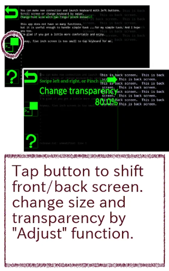 Since the keyboard is displayed on the full screen, adjust the transparency with left and right swipe, and select the keyboard type (alphabet, numeral, etc.) with top and bottom swipe.
