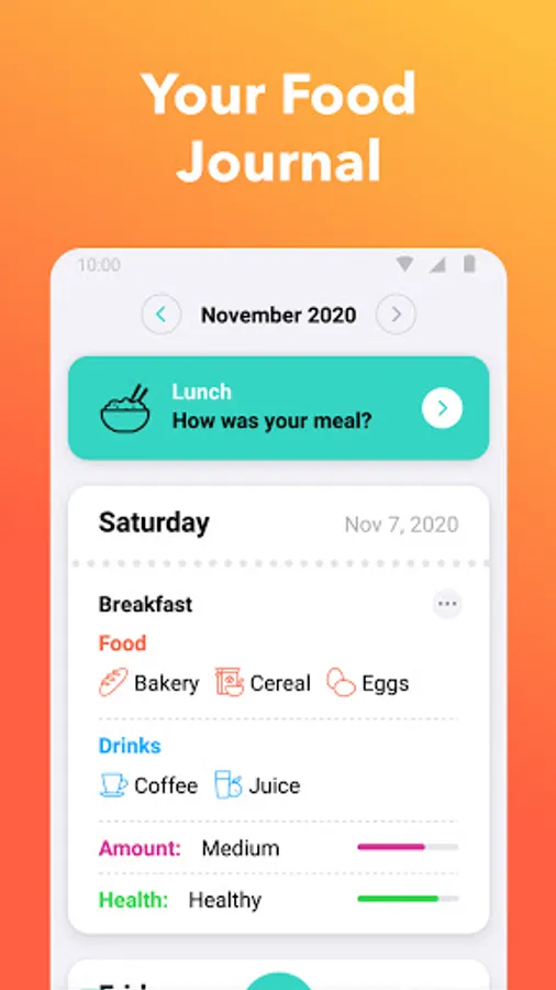 Set up useful reminders after each meal or once a day. When the time is right, fill in the form in a few seconds.