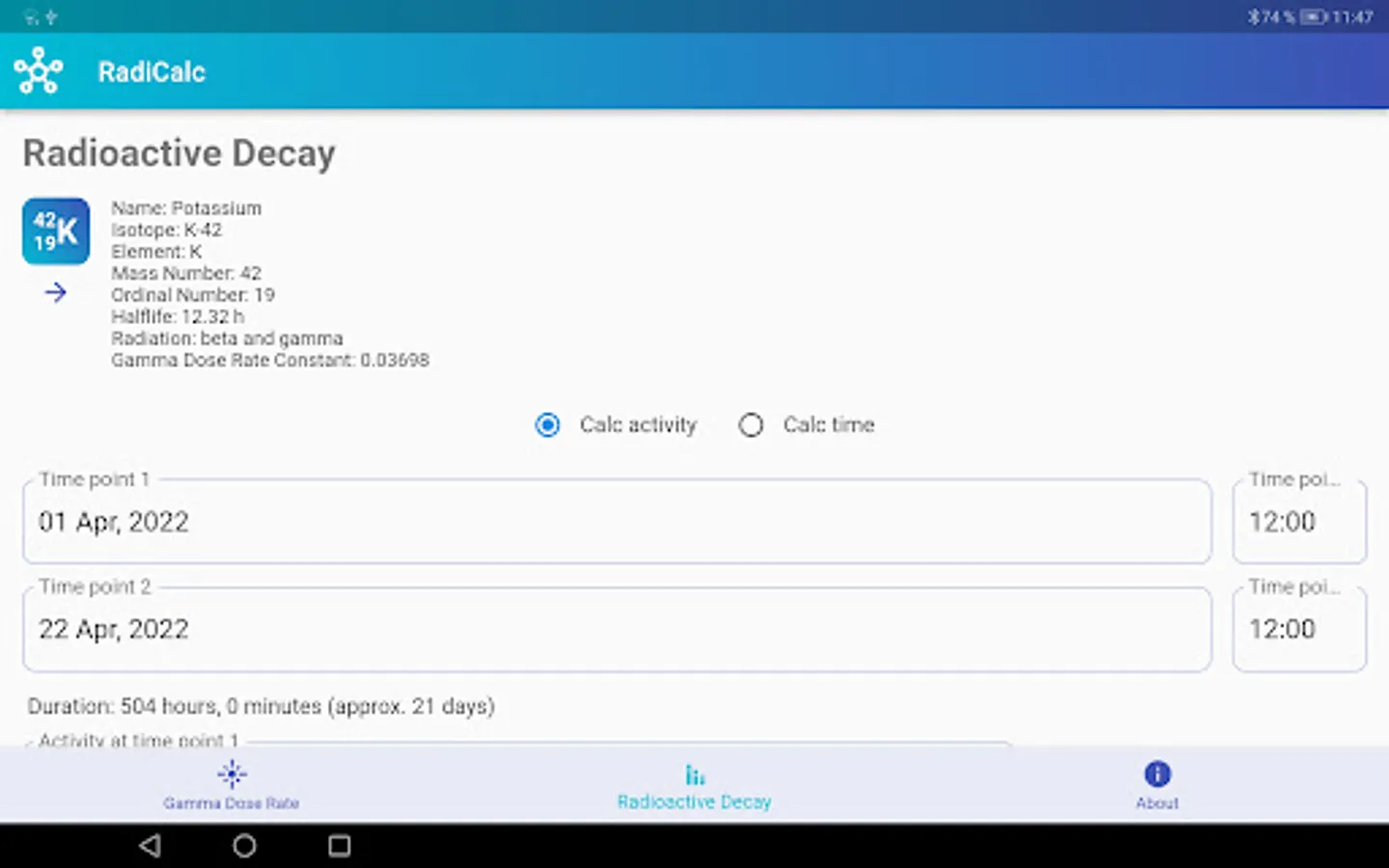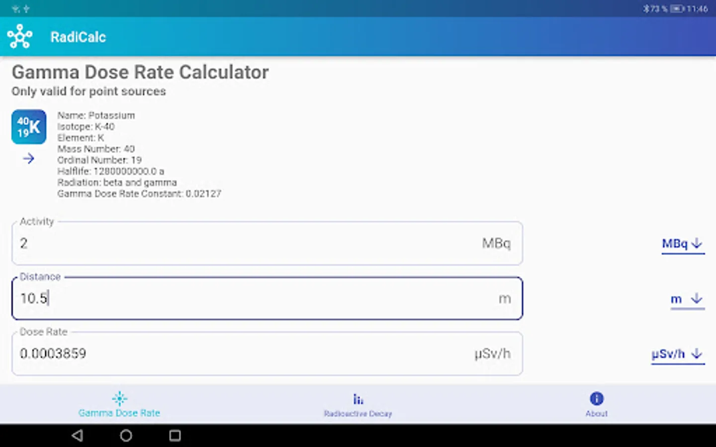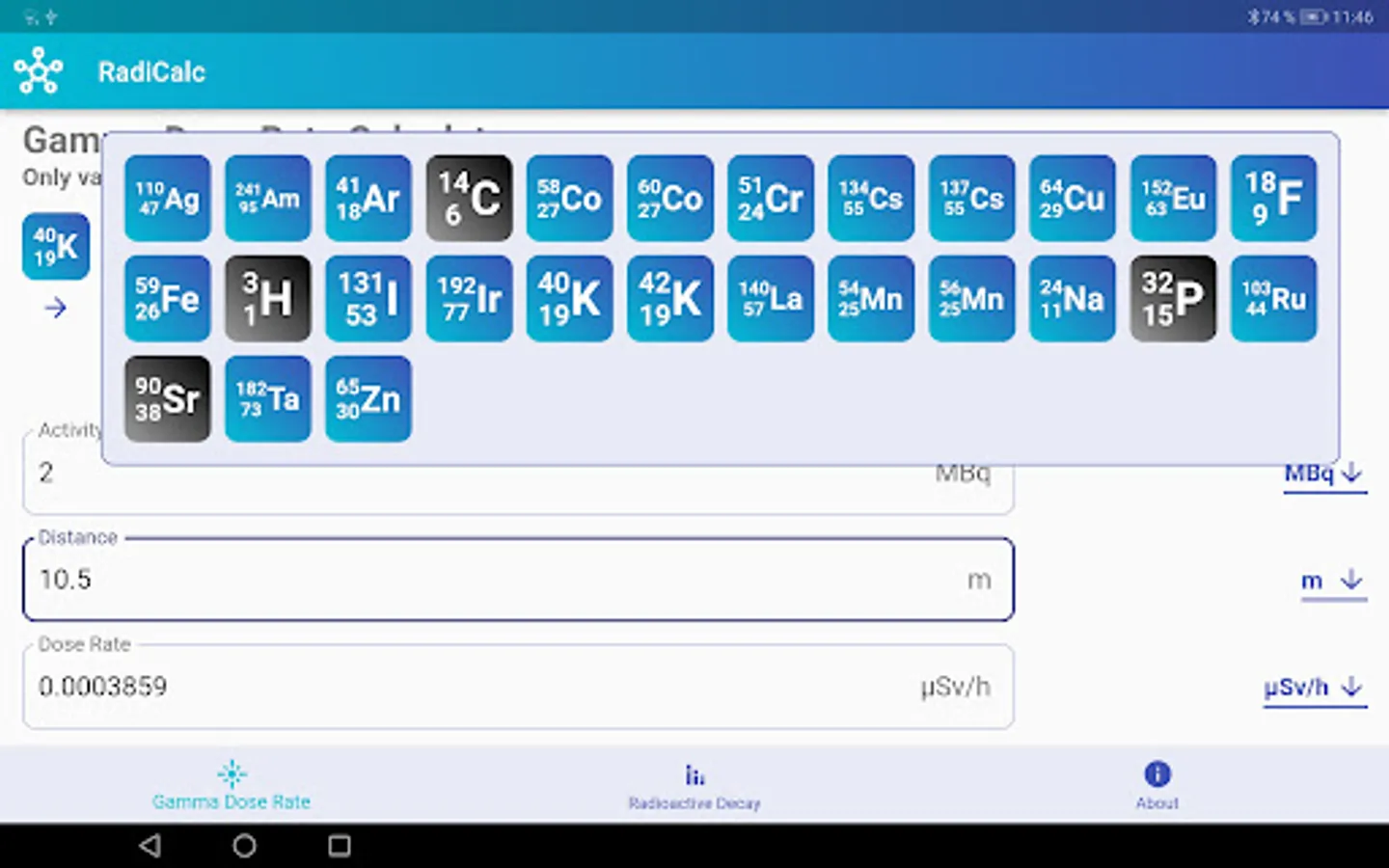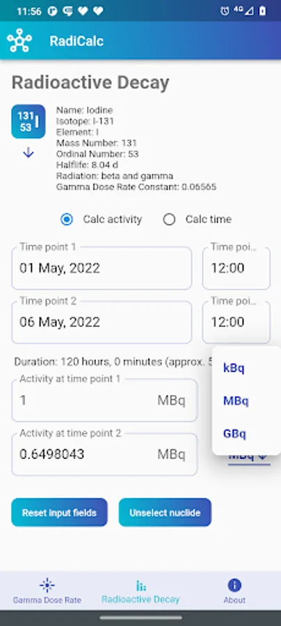 The app lets you select the data to be calculated, and for example derive from dose rate. Based on your input the according empty field is filled.