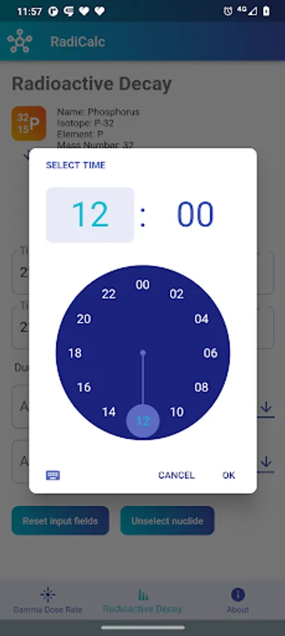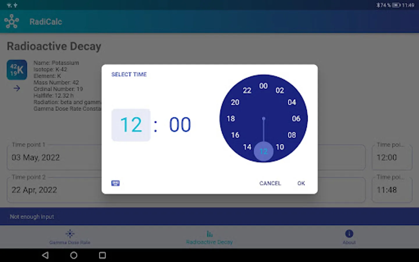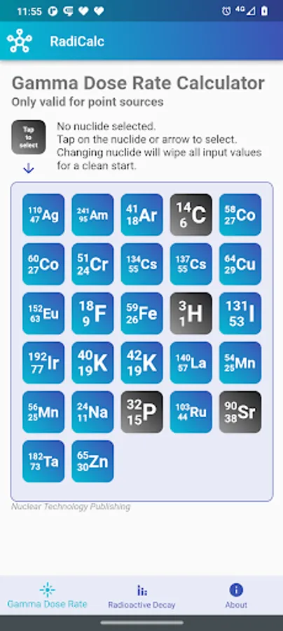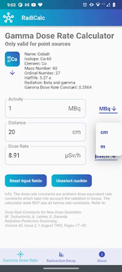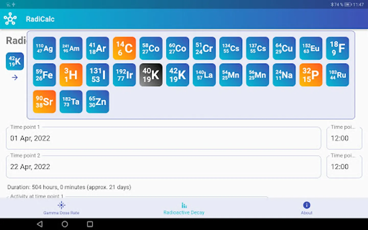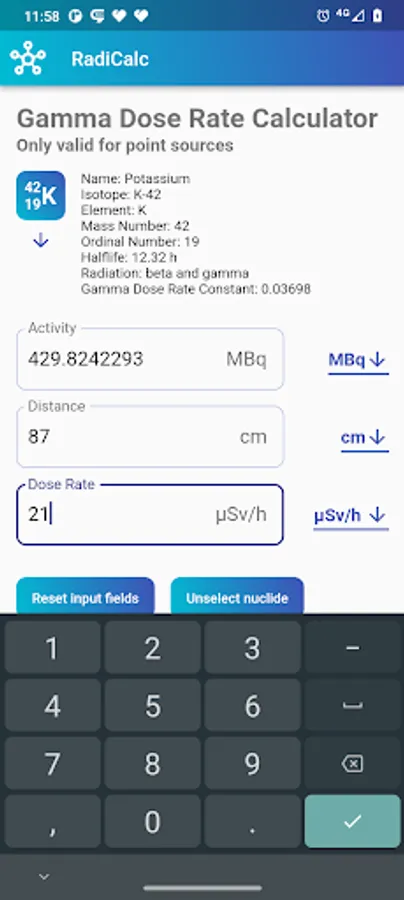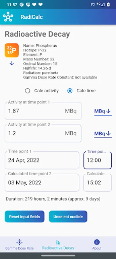The app lets you select the data to be calculated, and for example derive from dose rate. Based on your input the according empty field is filled.