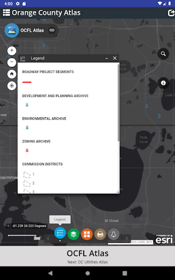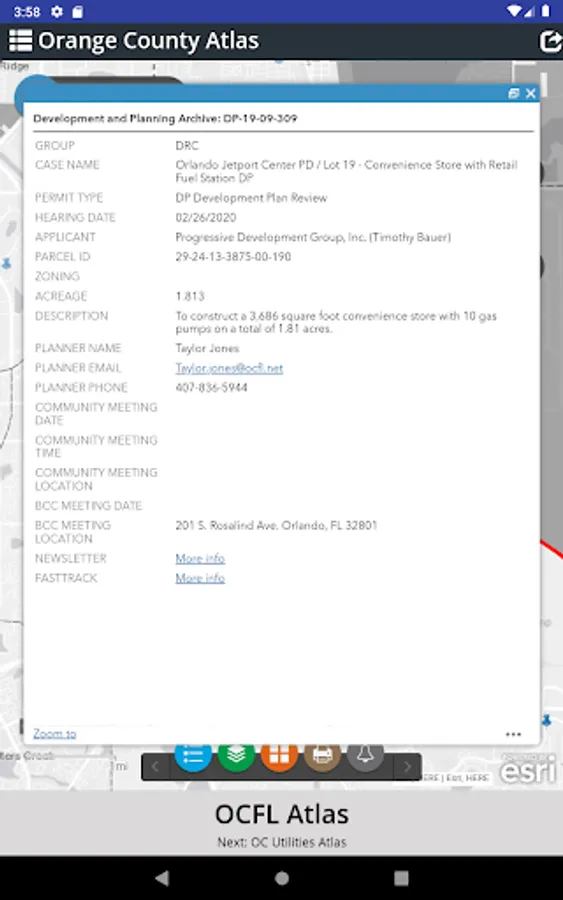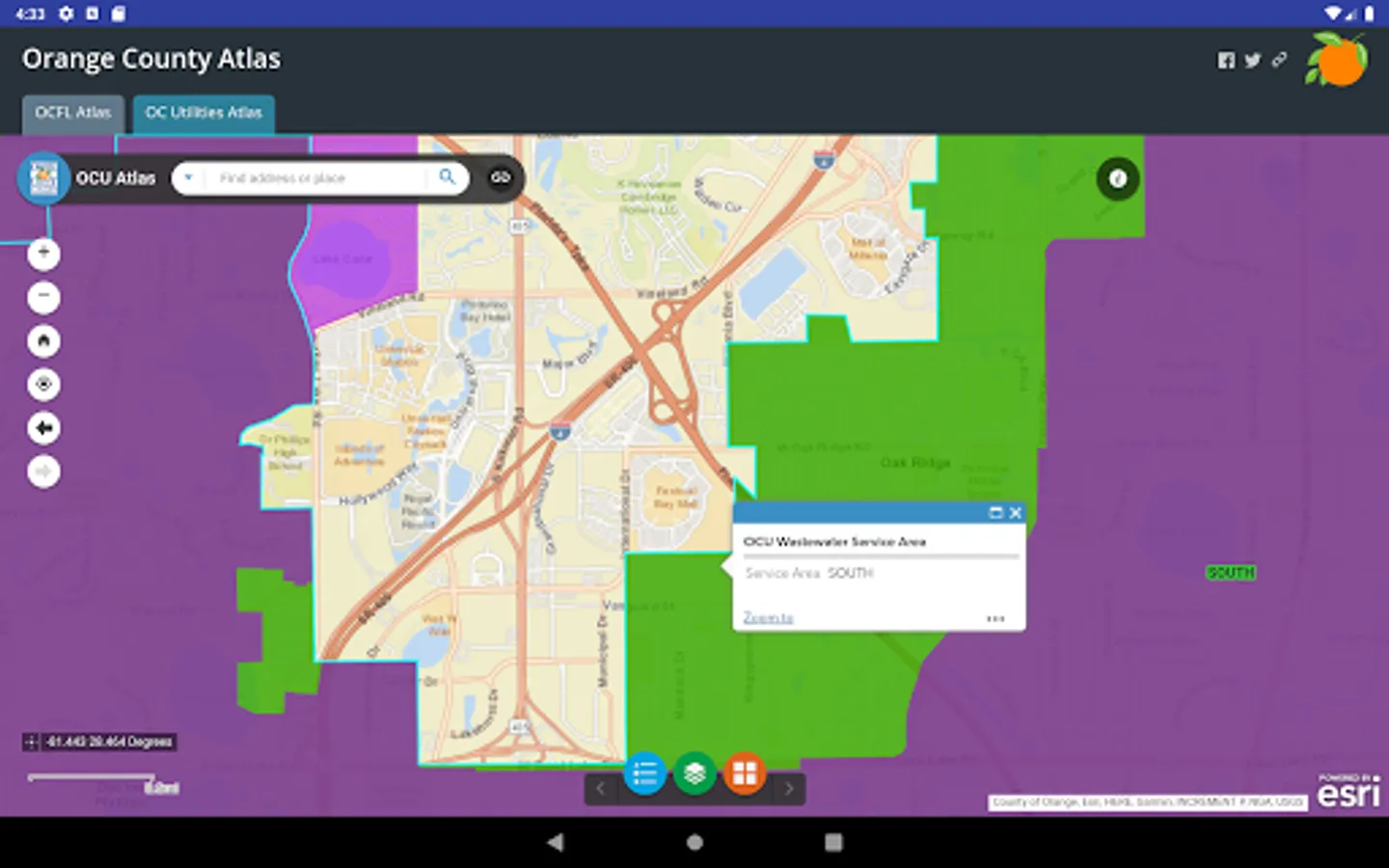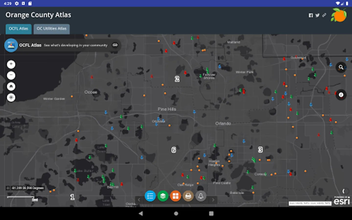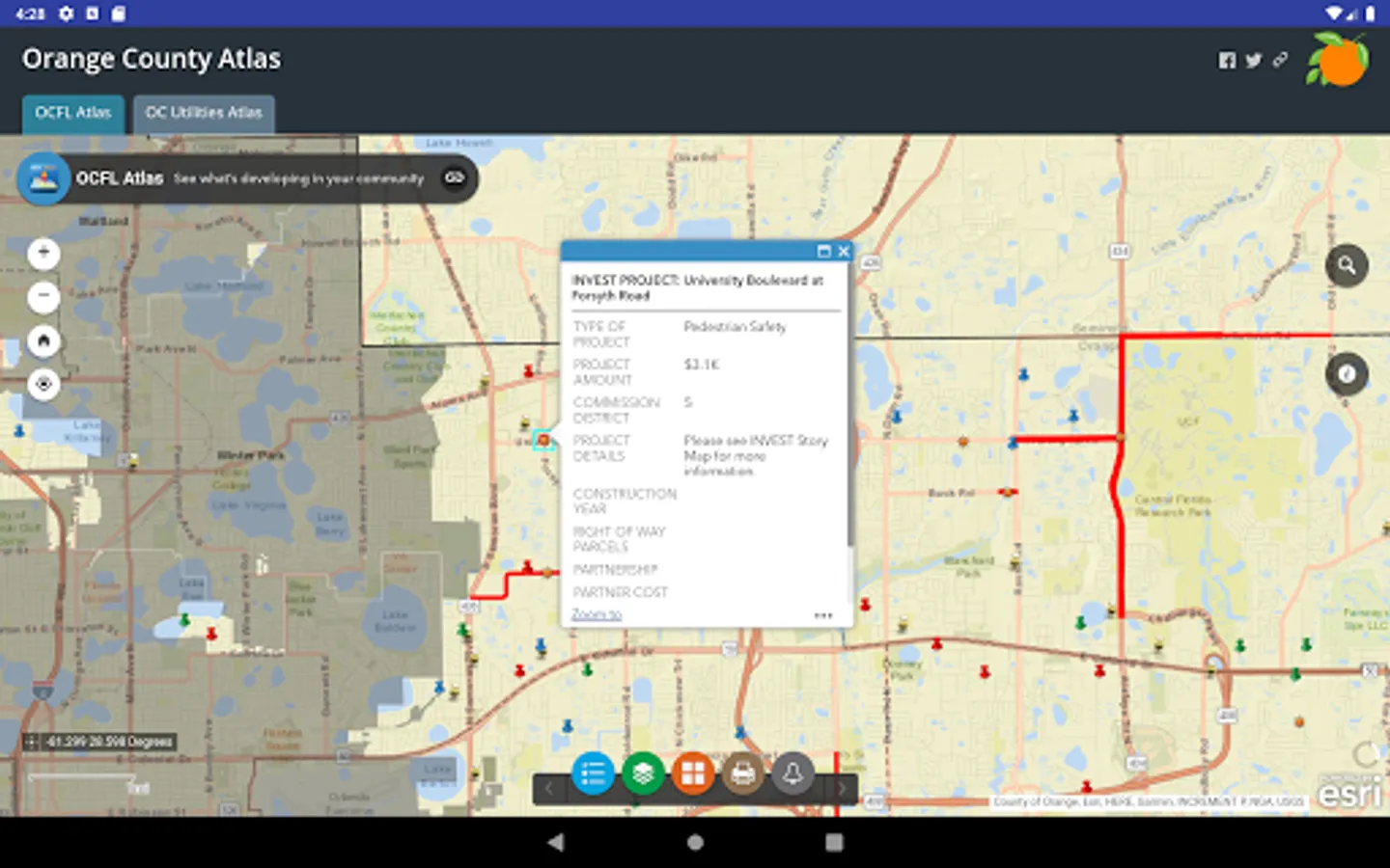 OCFL Atlas is an application that encourages citizens to become more engaged in the growth of their community by pinpointing new construction projects in Orange County. This app offers citizens the ability to access real-time development data, board meeting details and project locations. Users can zoom into their current location, search by address or pan around Orange County to see new projects. Public notification is required for development applications to ensure citizens have the opportunity to express opinions prior to a public hearing. OCFL Atlas is designed to work on most devices including desktop computers, smartphones and tablets.