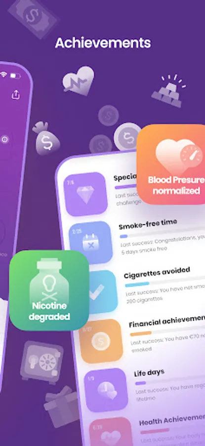 While quitting smoking you will receive many great achievements for your health progress, cigarettes avoided, money saved, smoke free time and much more.