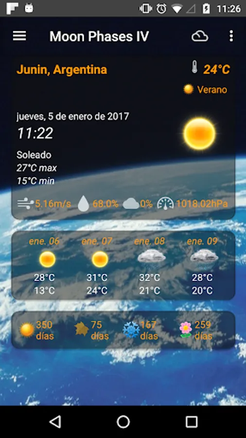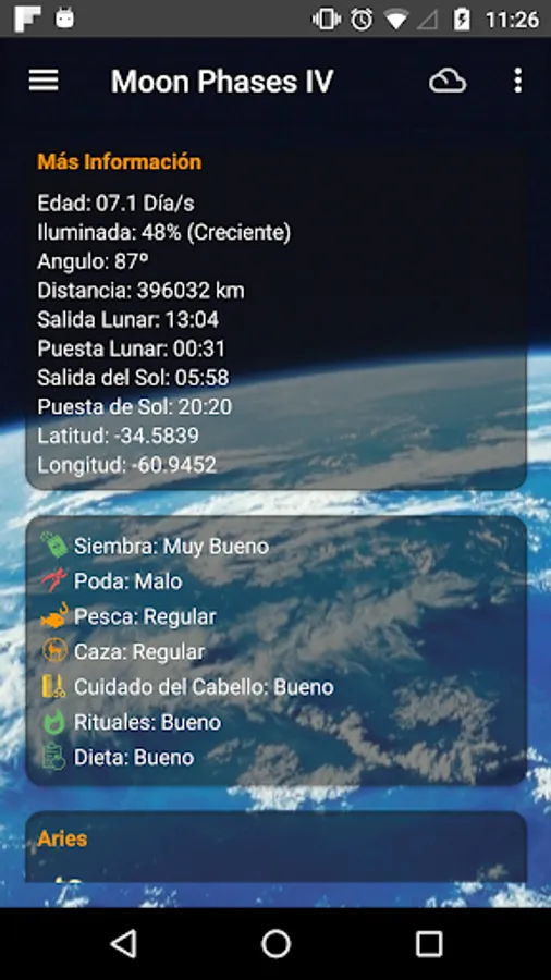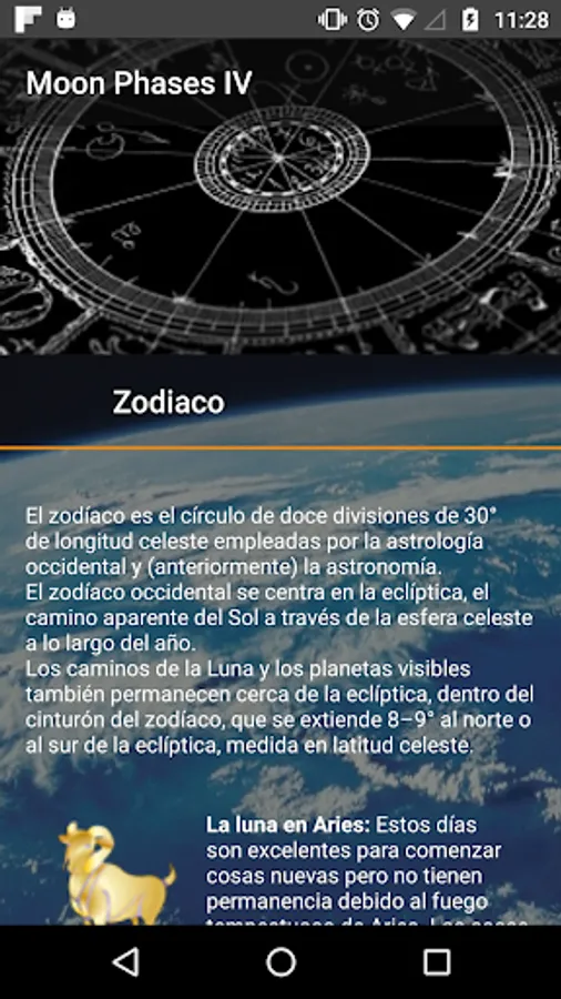 -Daily Phases: Shows the current phase and a complete description about the moon at this day.
