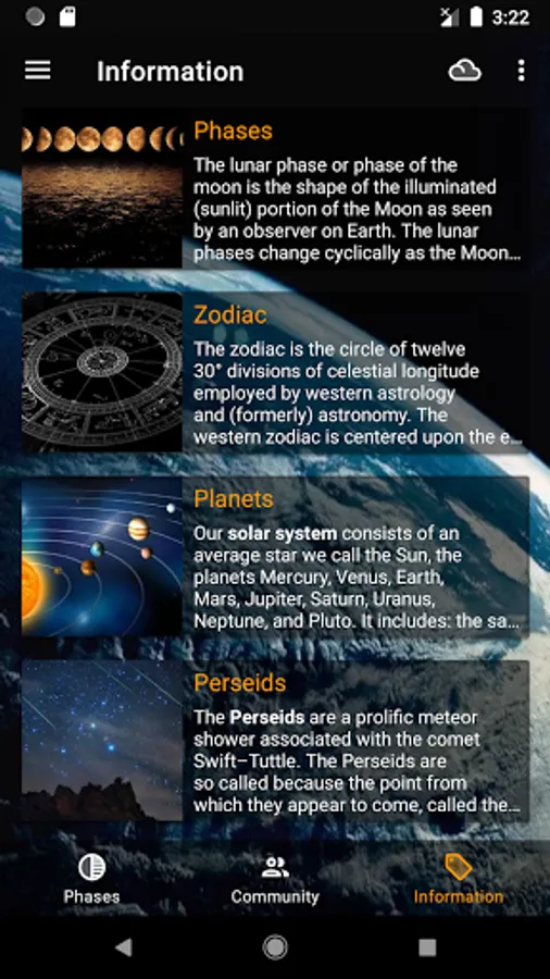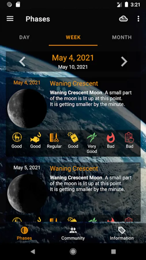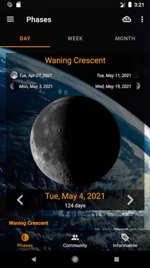 -Daily Phases: Shows the current phase and a complete description about the moon at this day.