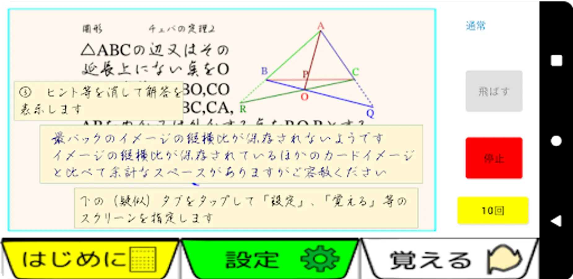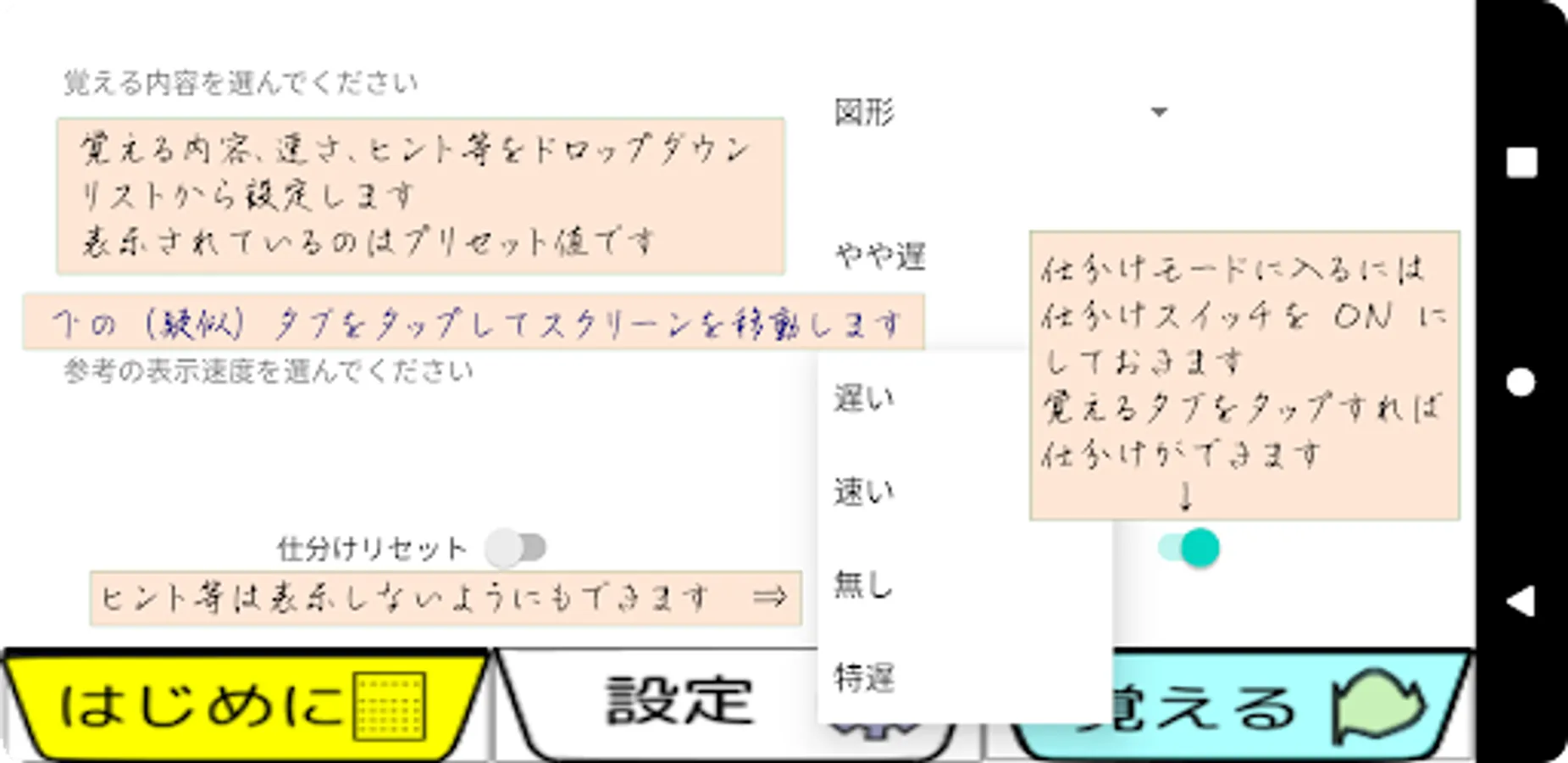 First, on the "Settings" tab, select and set the official type to remember, the display speed, and the display speed such as hints. You can also hide hints etc. If you want to sort, turn on the sort mode switch. It is OFF when you remember normally.