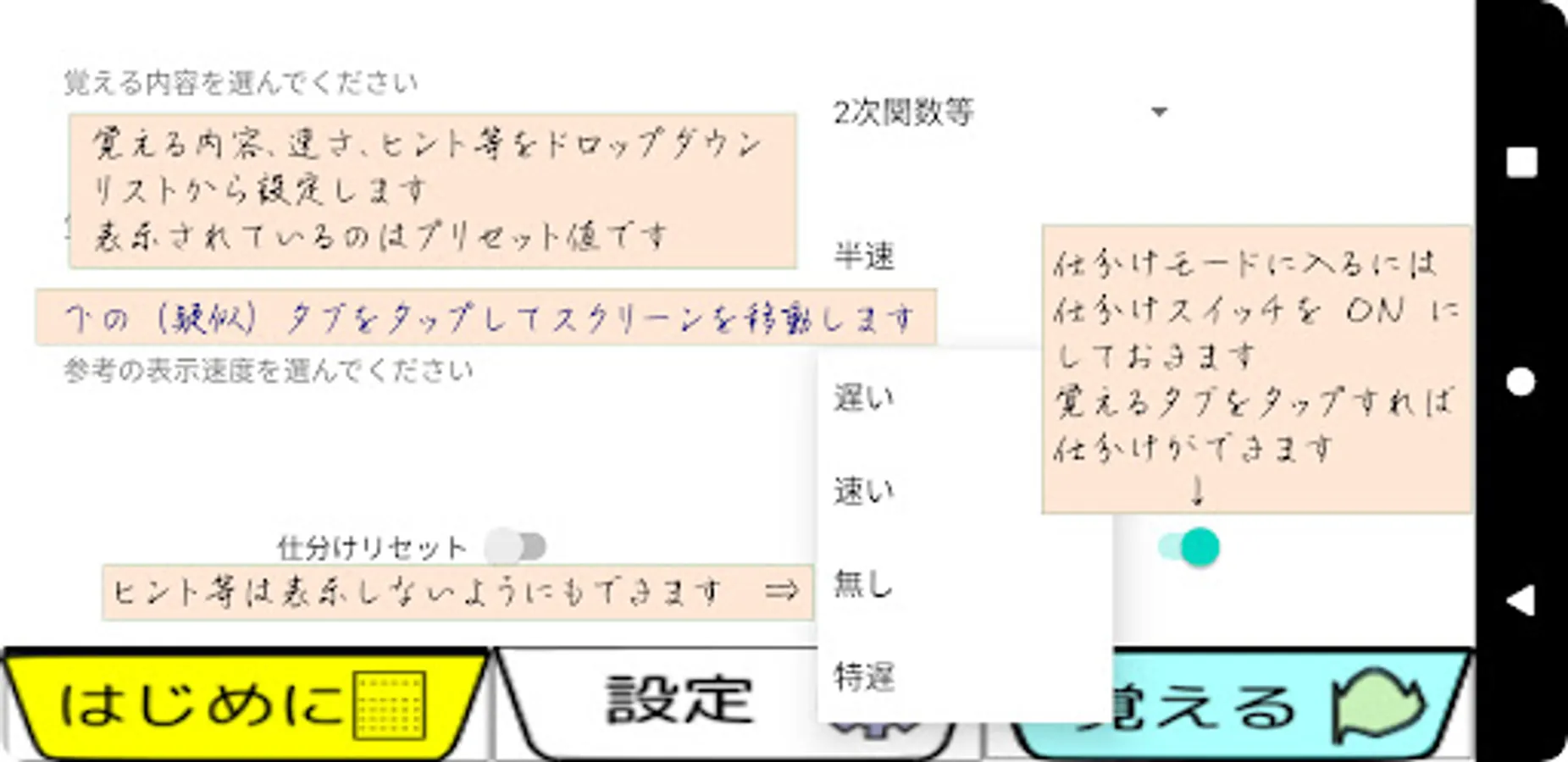 First, on the "Settings" tab, select and set the official type to remember, the display speed, and the display speed such as hints. You can also hide hints etc. If you want to sort, turn on the sort mode switch. It is OFF when you remember normally.