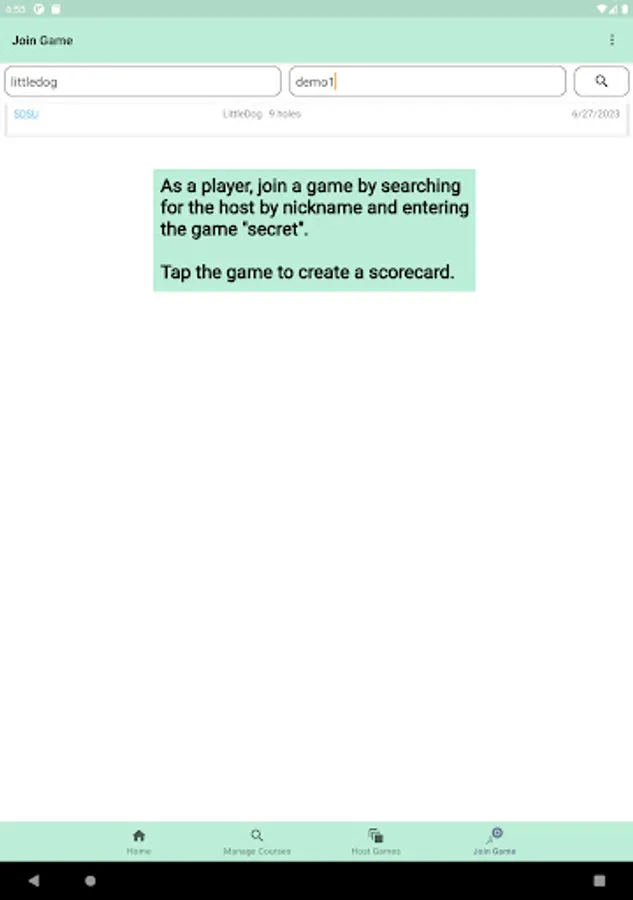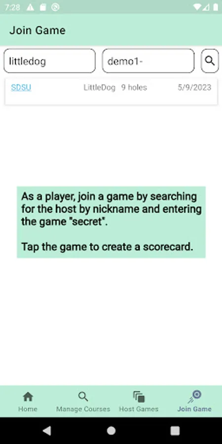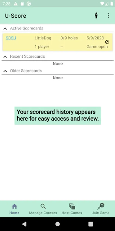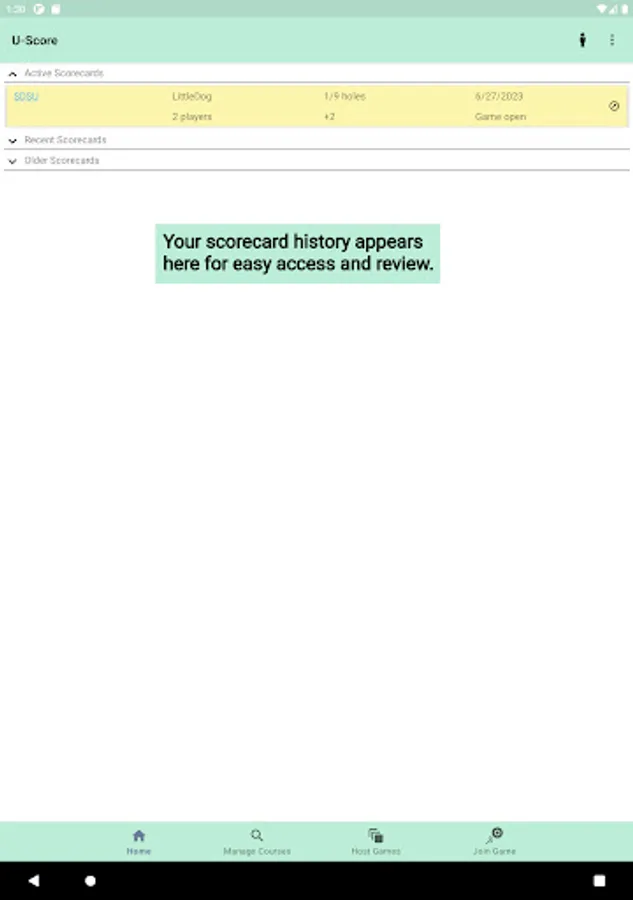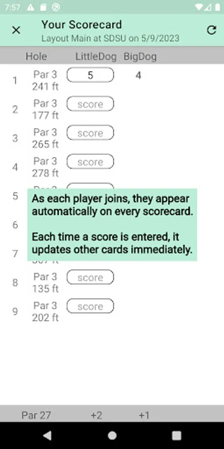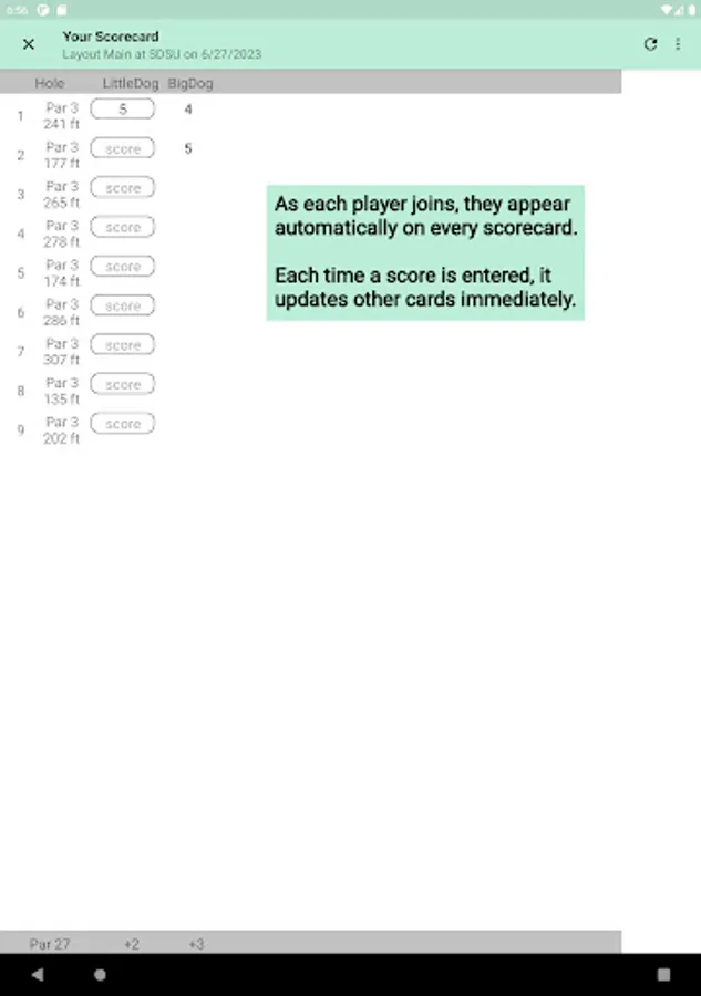 U-Score is a simple app to share disc golf scorecards among all players in a game. Each one keeps their own scores for each hole. As each score is made, all other scorecards are updated immediately.