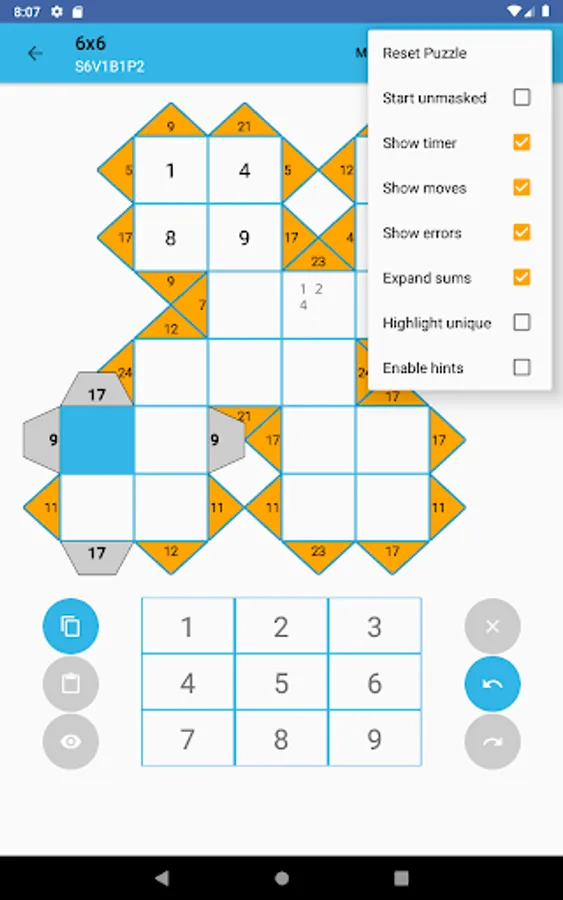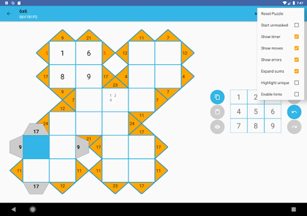 The object is to fill in the rows and columns with digits 1 to 9 (no duplicates) so that their sum matches the clues. Puzzles have only one solution, and can be solved without resorting to trial and error. Simple to understand, challenging to solve!