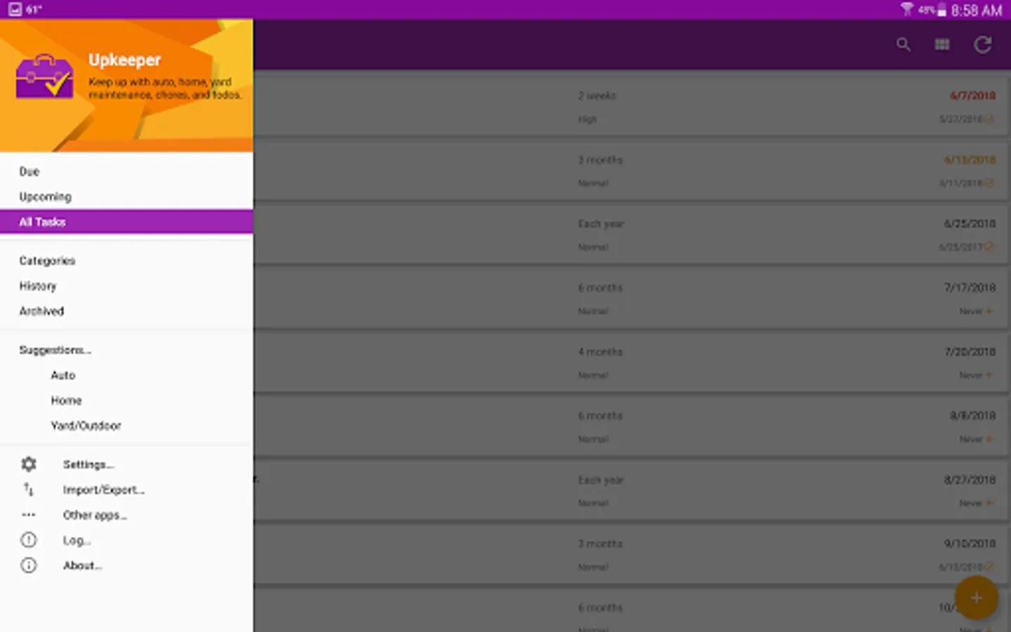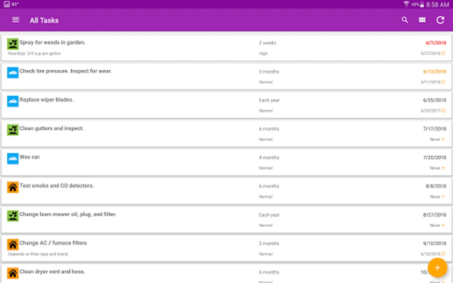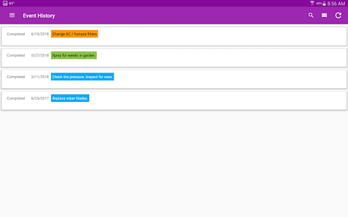 Simple to use personal maintenance manager. Set due dates for tasks and todos and organize them into categories. Receive reminders when items are due based on priority. Make notes, track history, and synchronize across multiple devices.