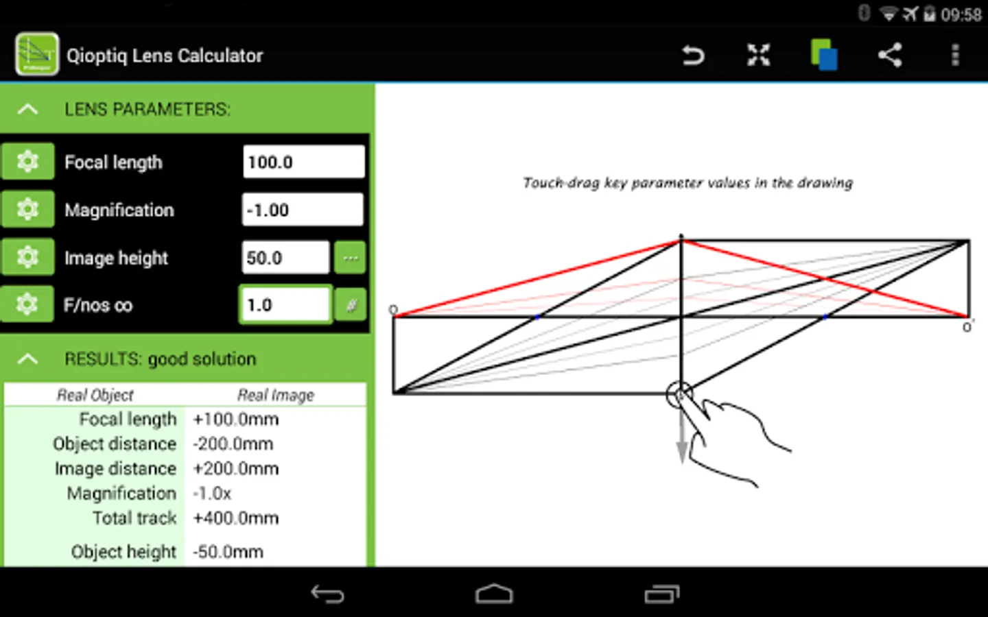 The ray diagram & nomogram are gesture enabled, so you can drag key features to edit focal length, object distance & size, image distance & size, aperture or principle plane distance. Graphics up-date as you drag - a true ‘lens equation’ visualiser!