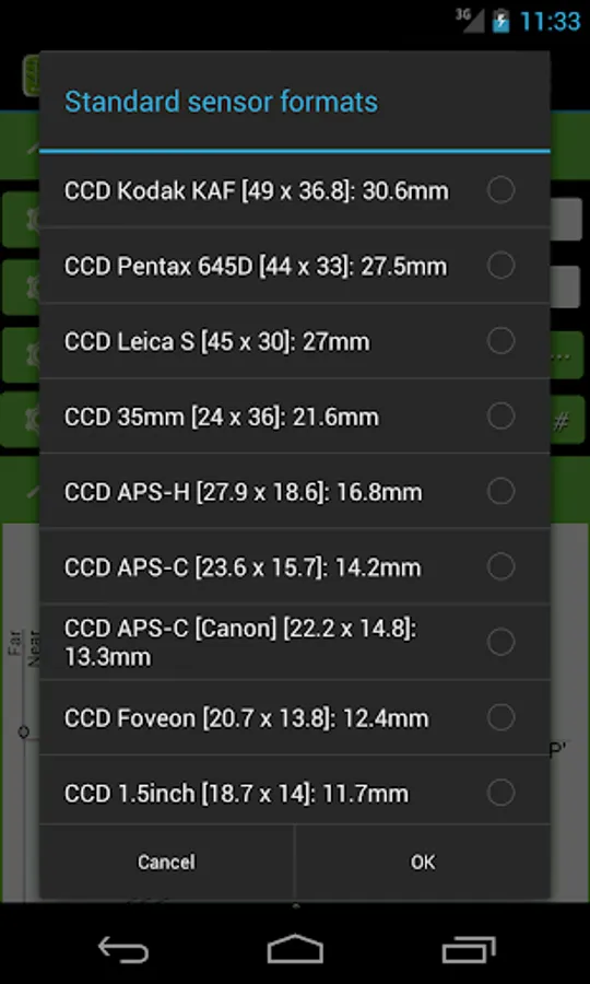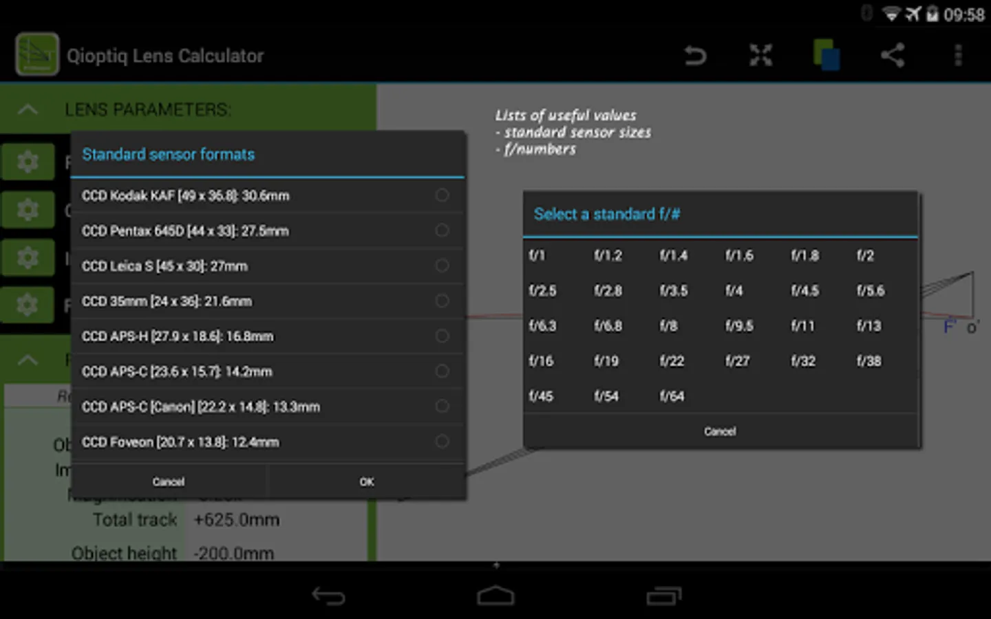Lens / mirror mode. Lists of standard f/#'s & sensor dims.