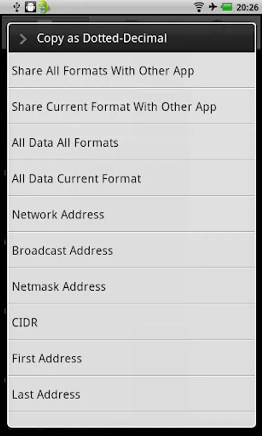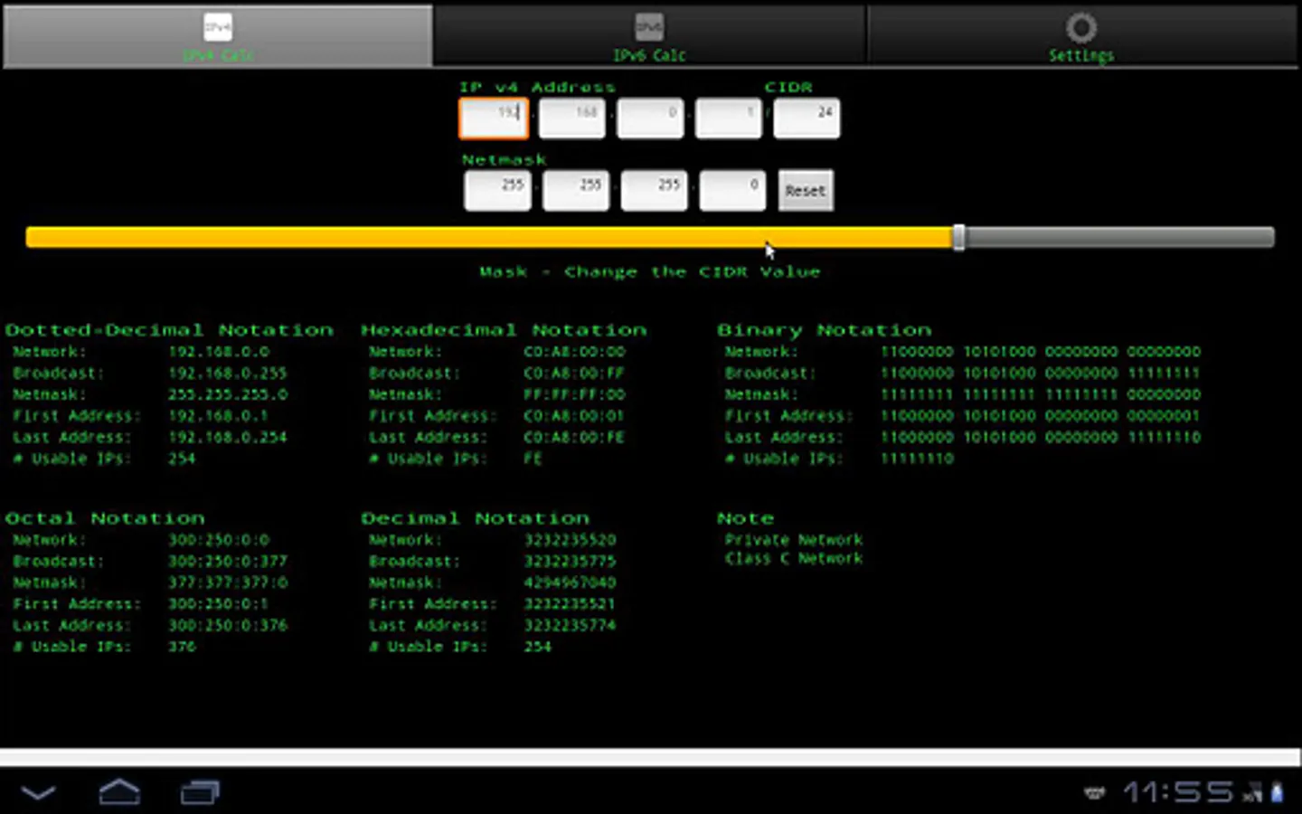 The application is useful for subnetting a router in tandem with an Android web browser or just for educational purposes. Education is emphasized by real time updating of network, broadcast, netmask, first and last address of the subnet, and the number of usable IPs in several different formats (dotted-decimal, hexadecimal, octal, decimal, binary and decimal). Also there are basic notes.