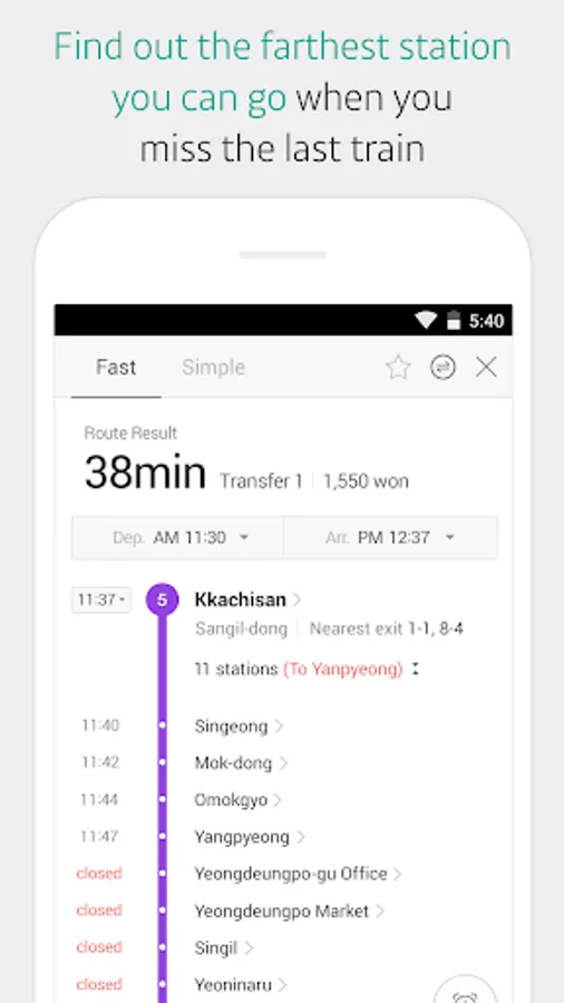 KakaoMetro shows you the fastest routes to your destination as of the current time.