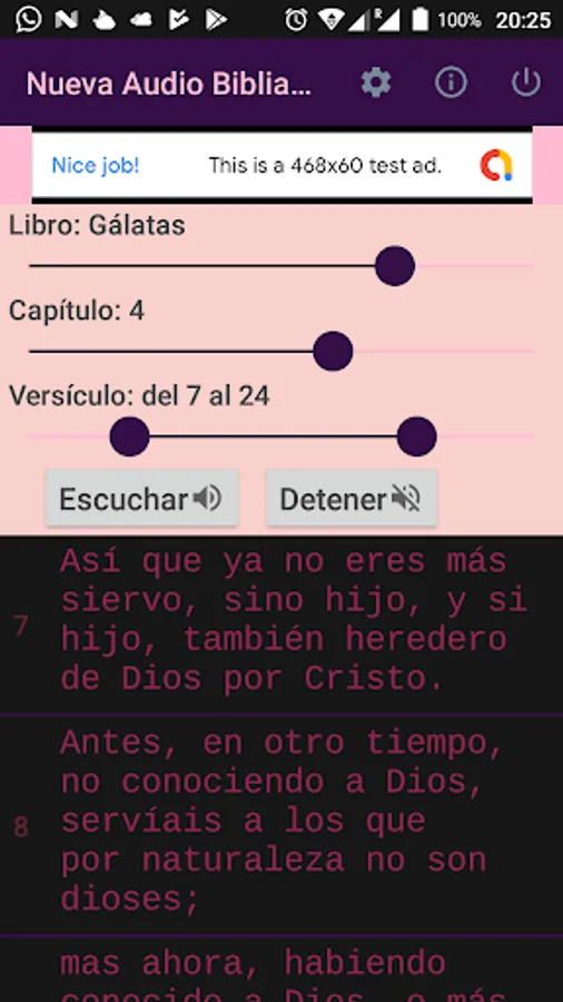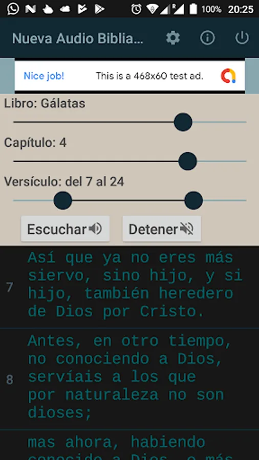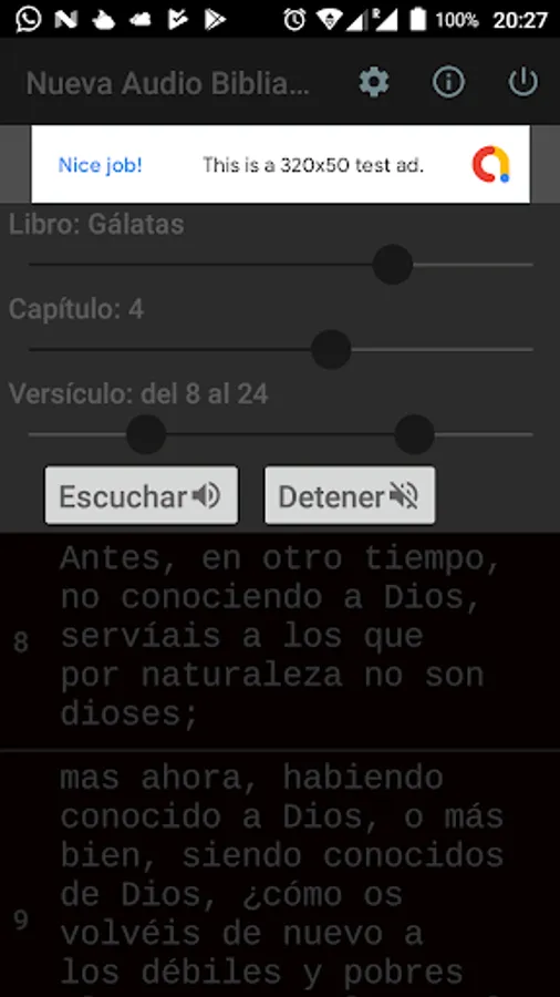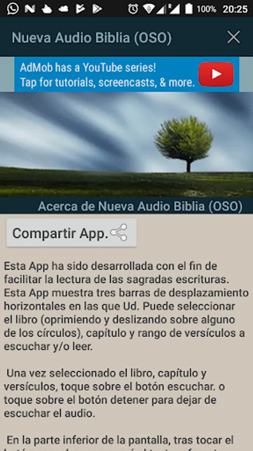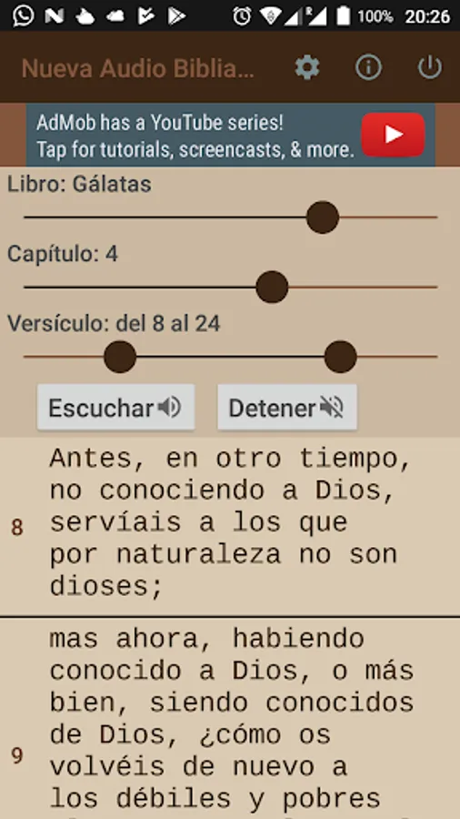 Through a simple and intuitive user interface, listen to and read the different books of the holy scriptures. This app uses Google's technology known as text to speech (TTS) which, in this case, reads the sacred scriptures in real time. This leads to less memory space consumption on the mobile device. This App does not require an Internet connection, so you can enjoy the scriptures without having an active connection.
