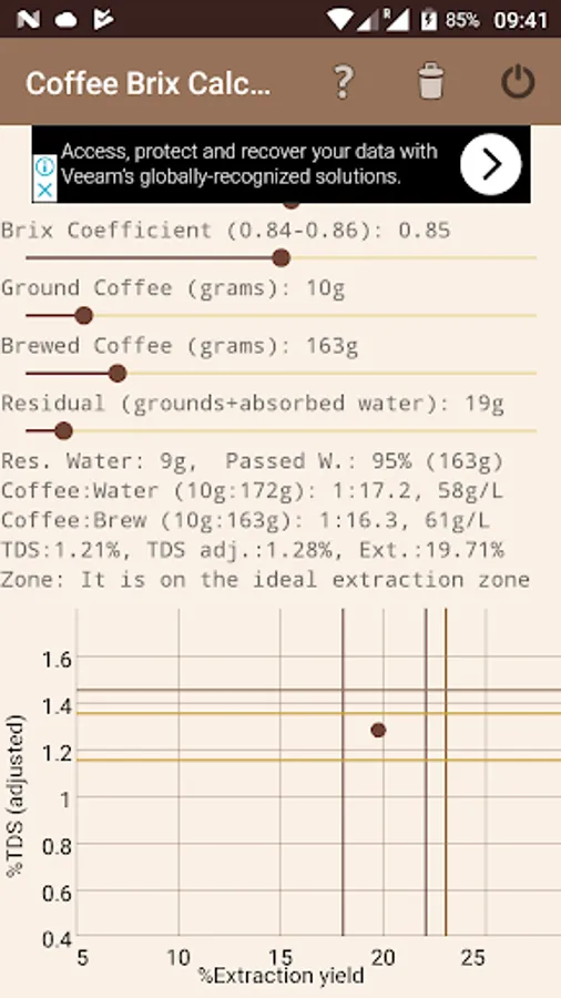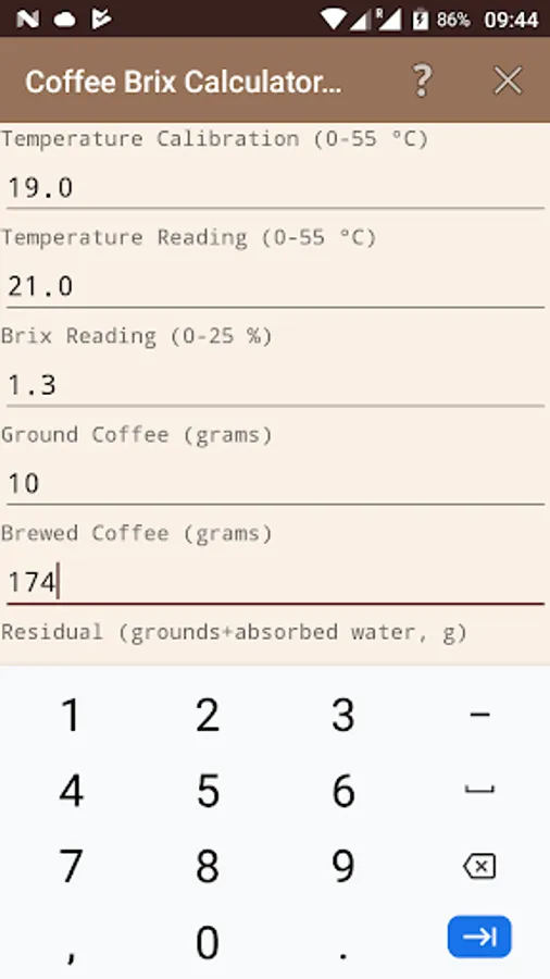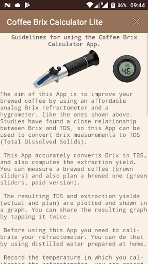 This is the lite version of the Coffee Brix Calculator. This version allows you to compute the extraction yield of a brewed coffee. This app accurately converts Brix to TDS (Total Dissolved Solids) using an affordable analog Brix refractometer.