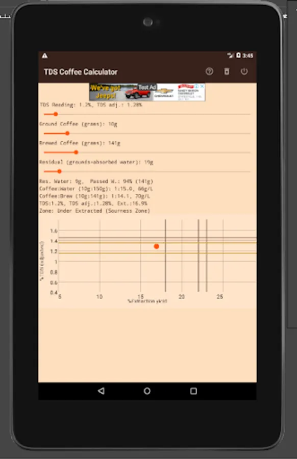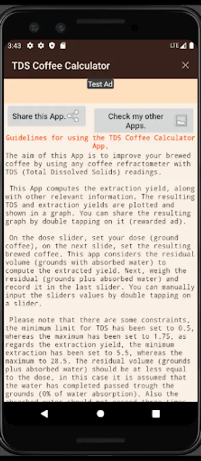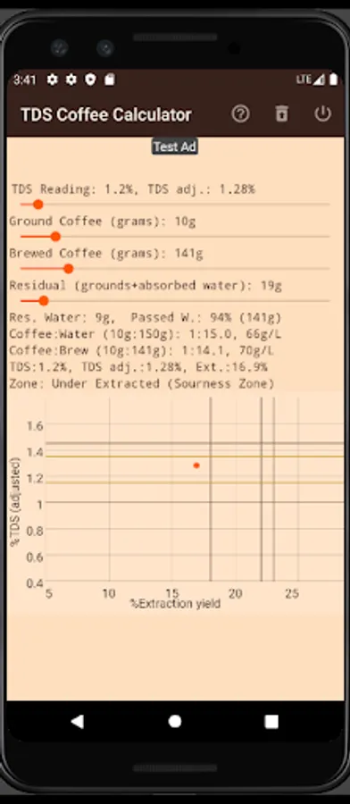 This App computes the extraction yield, along with other relevant information. The resulting TDS and extraction yields are plotted and shown in a graph. You can share the resulting graph by double tapping on it (rewarded ad).