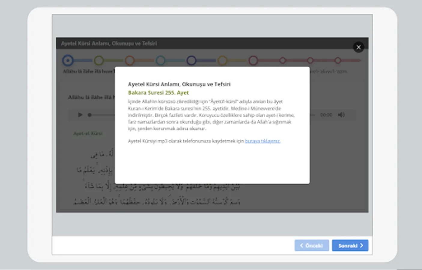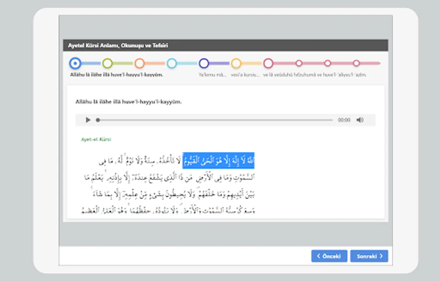 In practice, the verse is divided into 7 parts, and each part is read aloud, written in Arabic, and translated. In this way, it is aimed to facilitate memorization.
