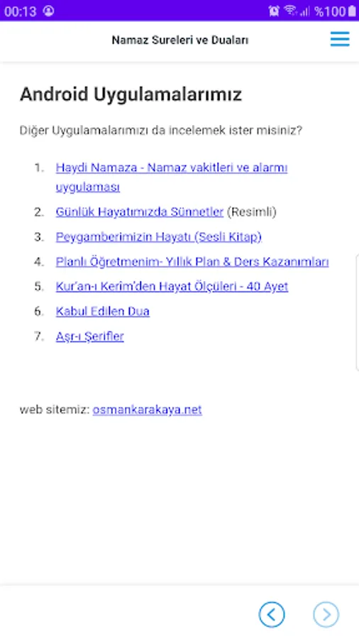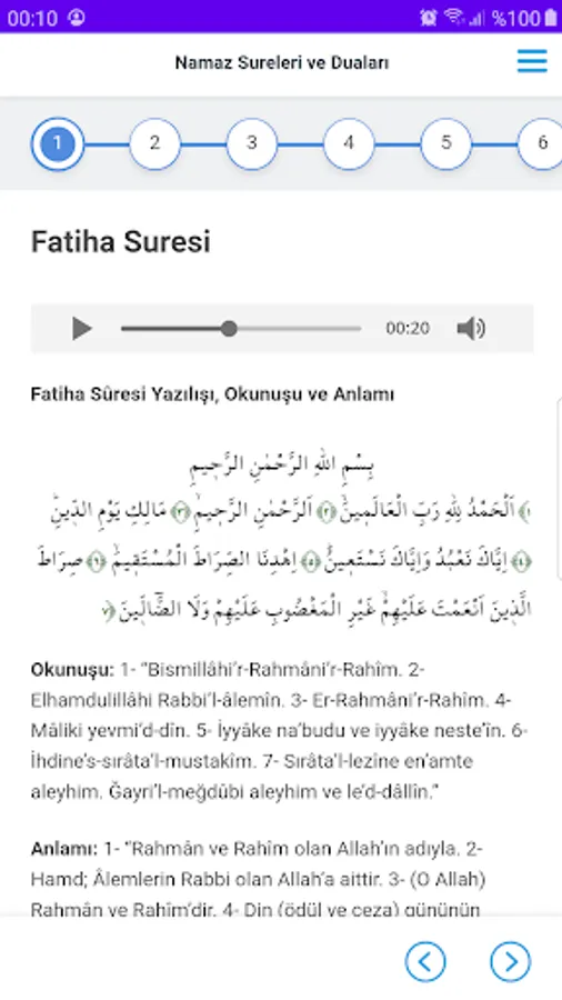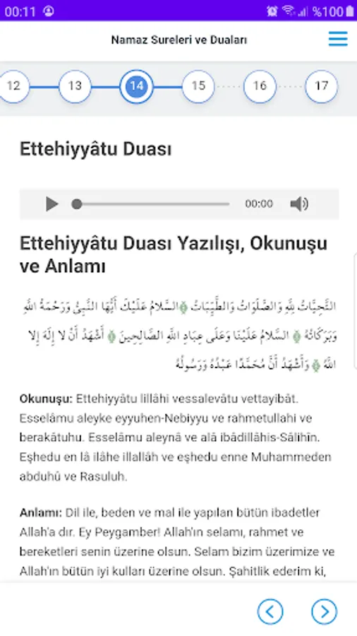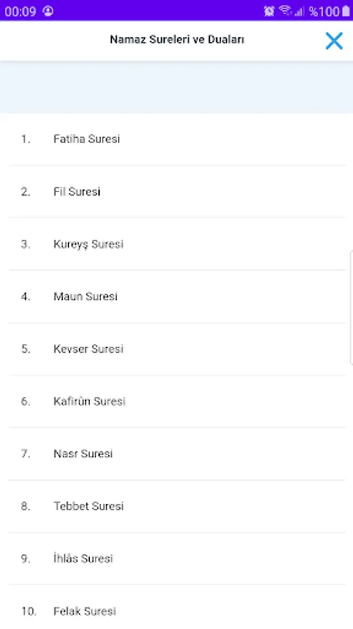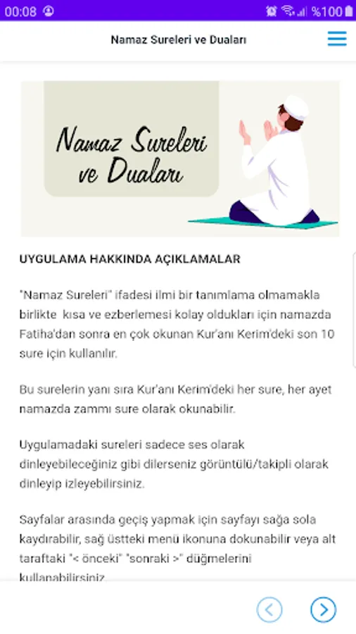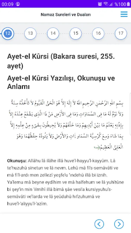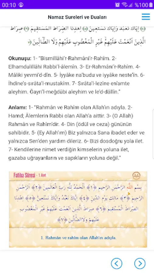 In the application, the writing, reading and meanings of the following suras and prayers are included.